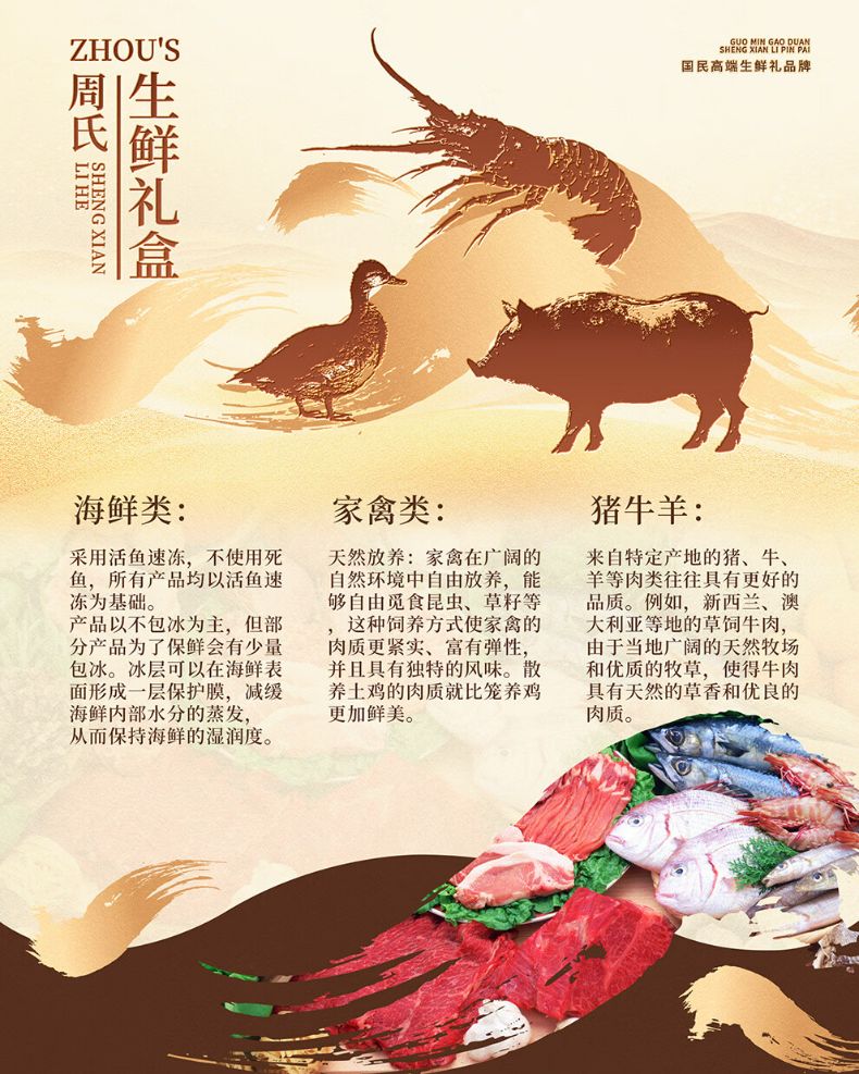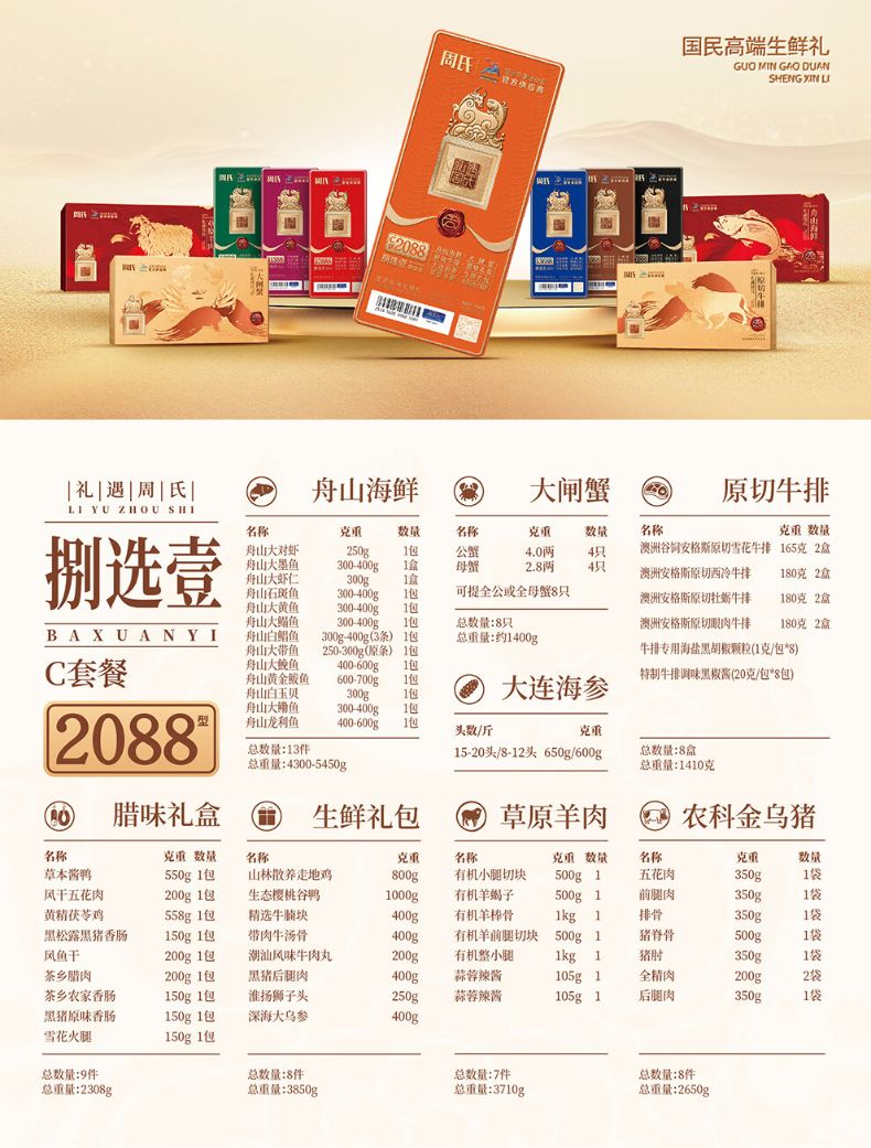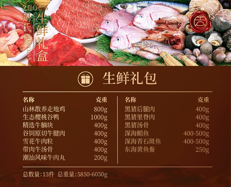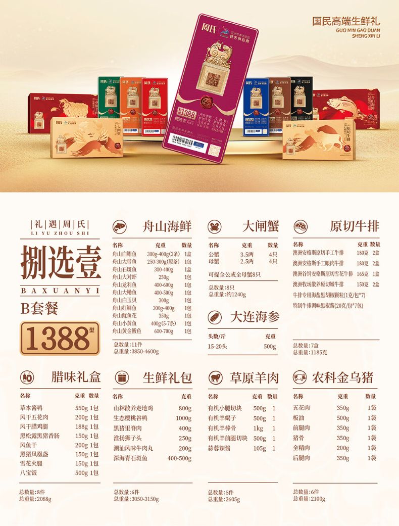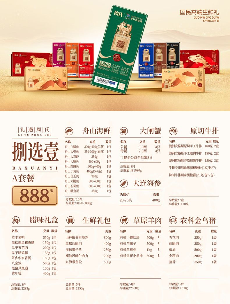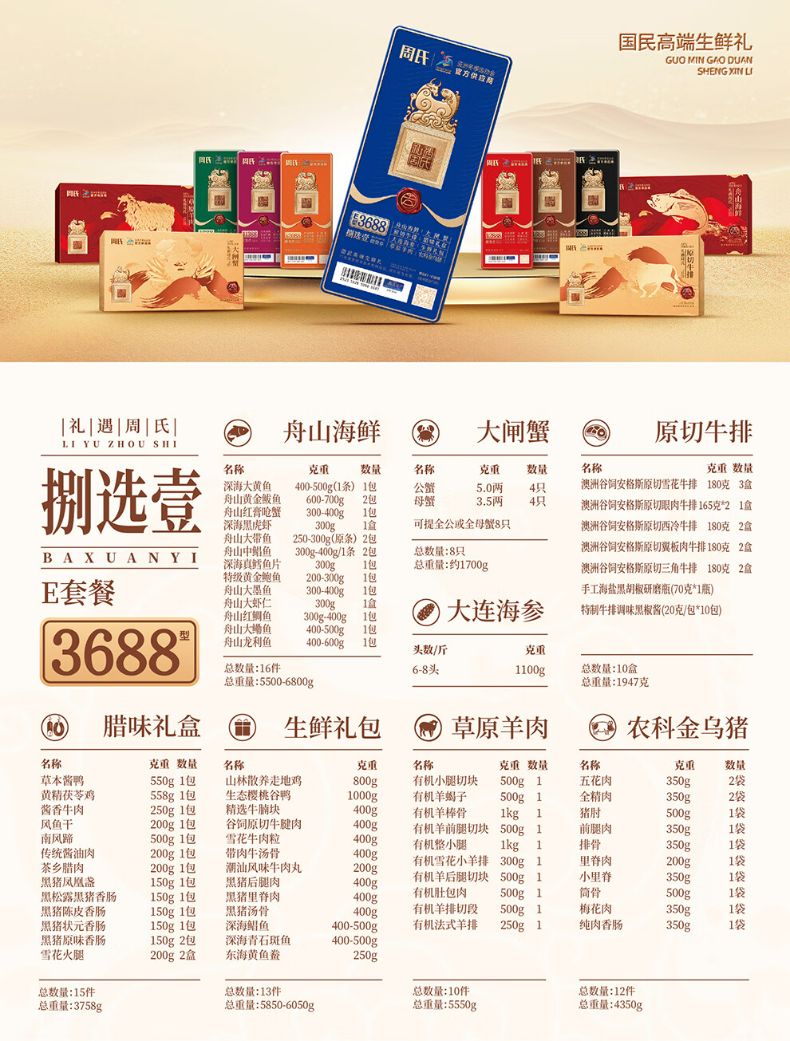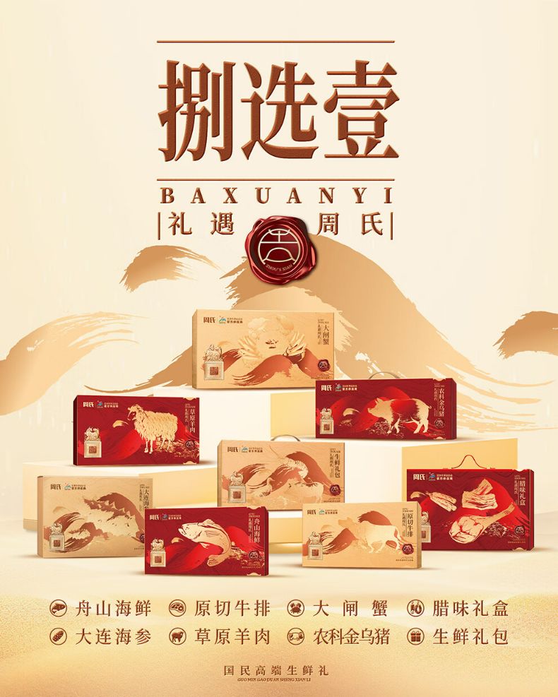 商品名称:周氏 国鲜八选一年货礼盒多选券 顺丰 全国通用 长期有效 (如要发实物 请备注)