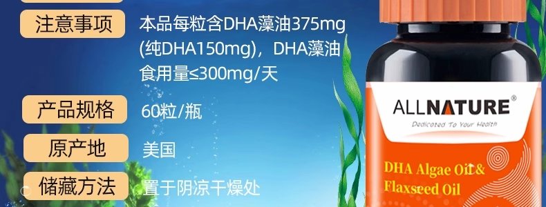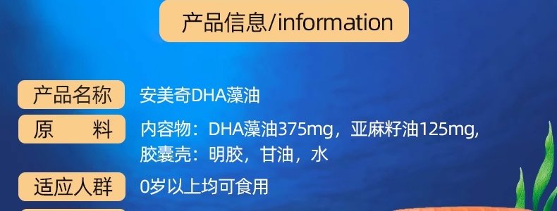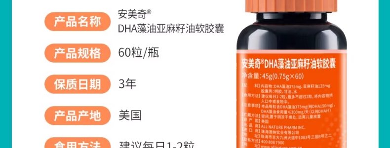 商品名称:美国 安美奇 原装进口 DHA藻油亚麻籽油软胶 60片/瓶