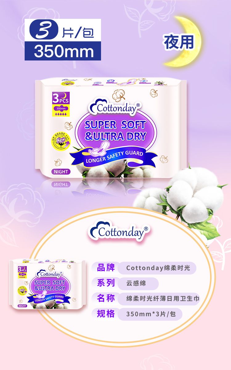商品名称:COTTONDAY 绵柔时光纤薄云绵夜用卫生巾350mm3片*2包