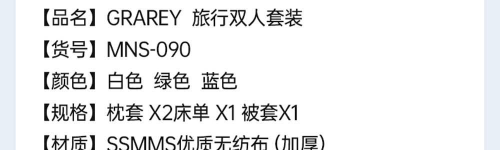 商品名称:格瑞亚 (GRAREY)旅行双人套装 白色*3包(枕套x6+床单x3+被套x3)