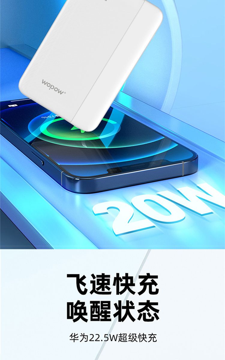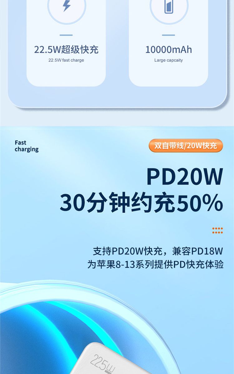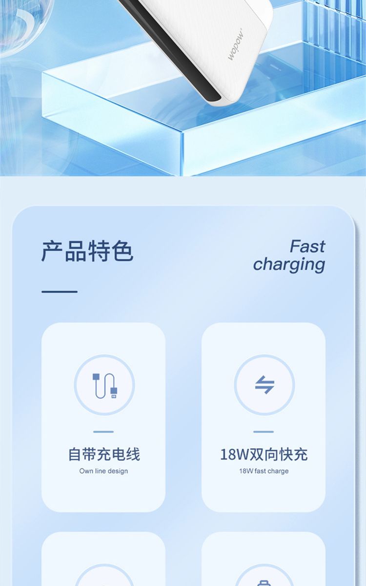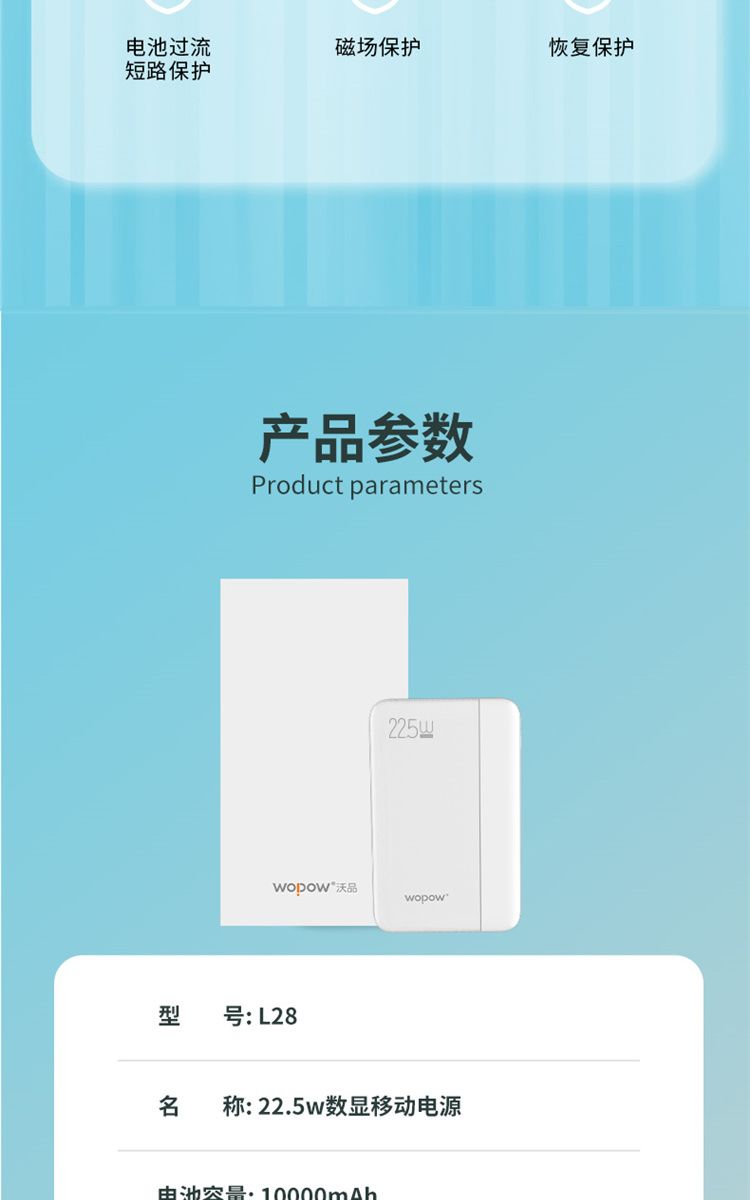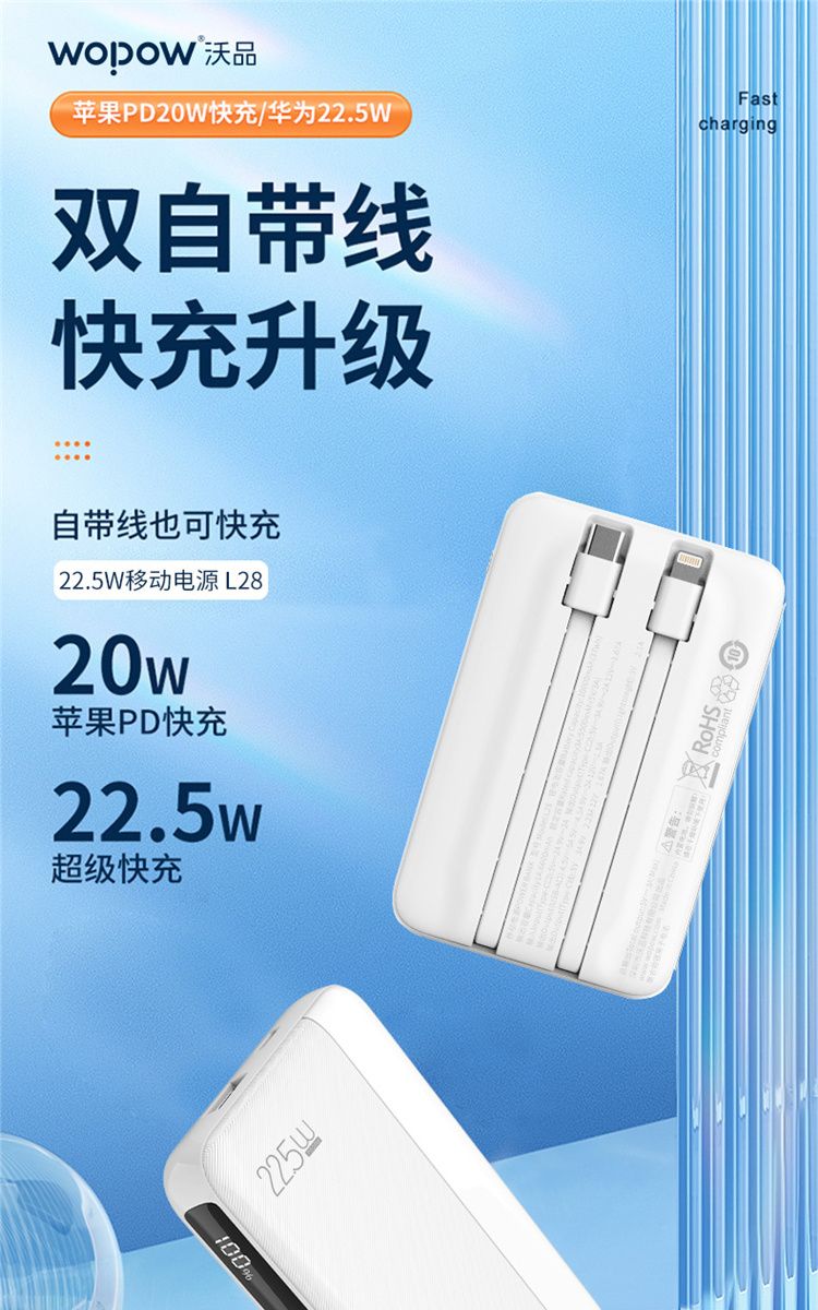 商品名称:沃品自带双线移动电源L28 双向快充小巧便携屏显22.5w大容量充电宝10000mAh