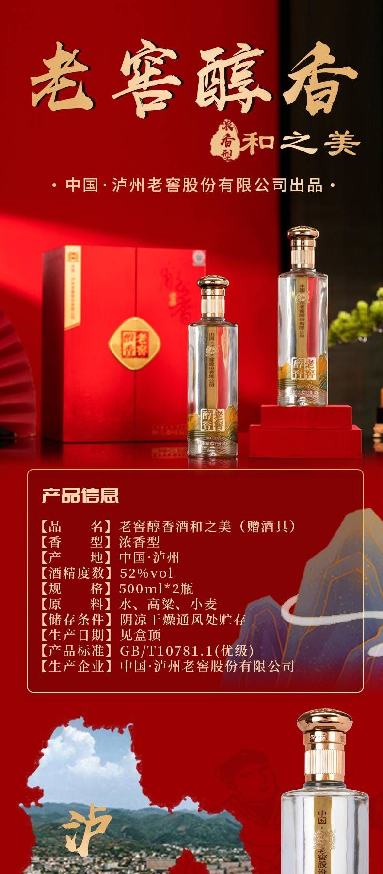 商品名称:泸州老窖 老窖醇香和之美52度浓香型白酒 500ML*2瓶礼盒装