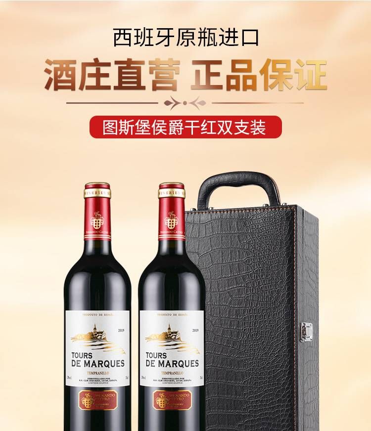 皮盒+酒具4件套 西班牙原瓶进口图斯堡侯爵干红葡萄酒750ml*2