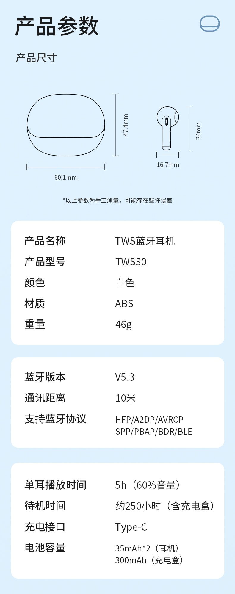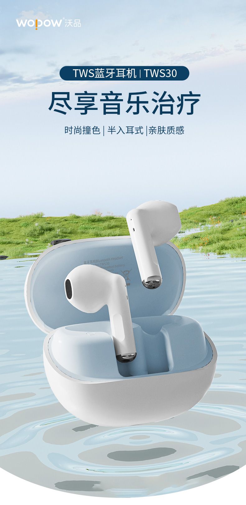 商品名称:沃品TWS蓝牙耳机TWS30 真无线蓝牙耳机半入耳式游戏运动适用于苹果安卓手机
