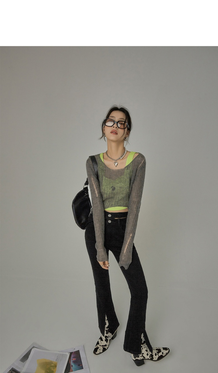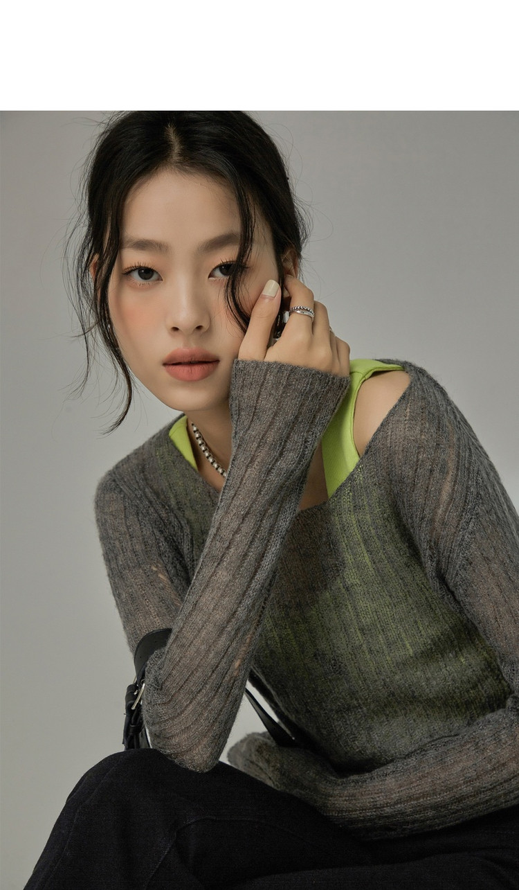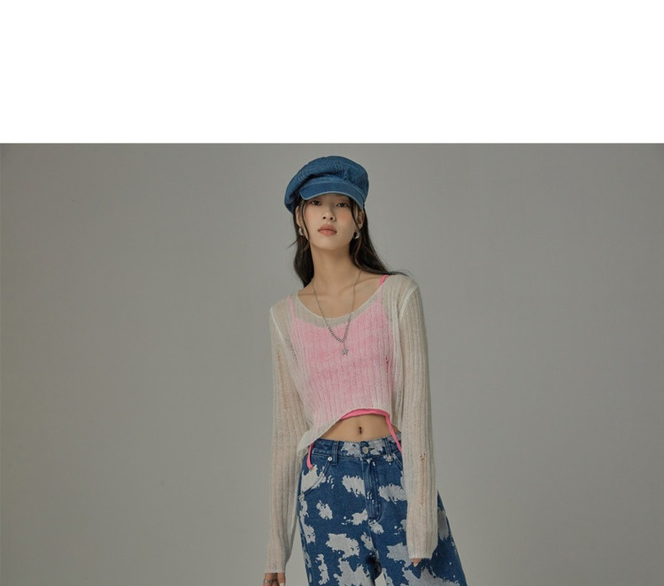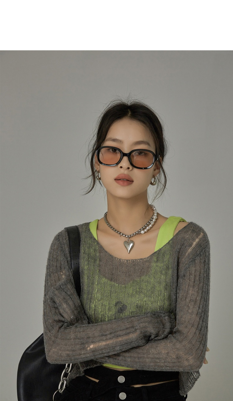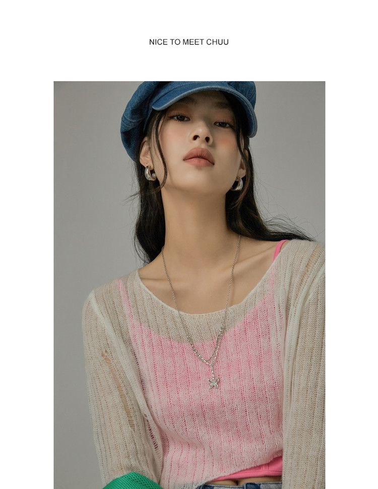 CHUU纯色透视性感针织衫女春秋薄低圆领长袖上衣 752979