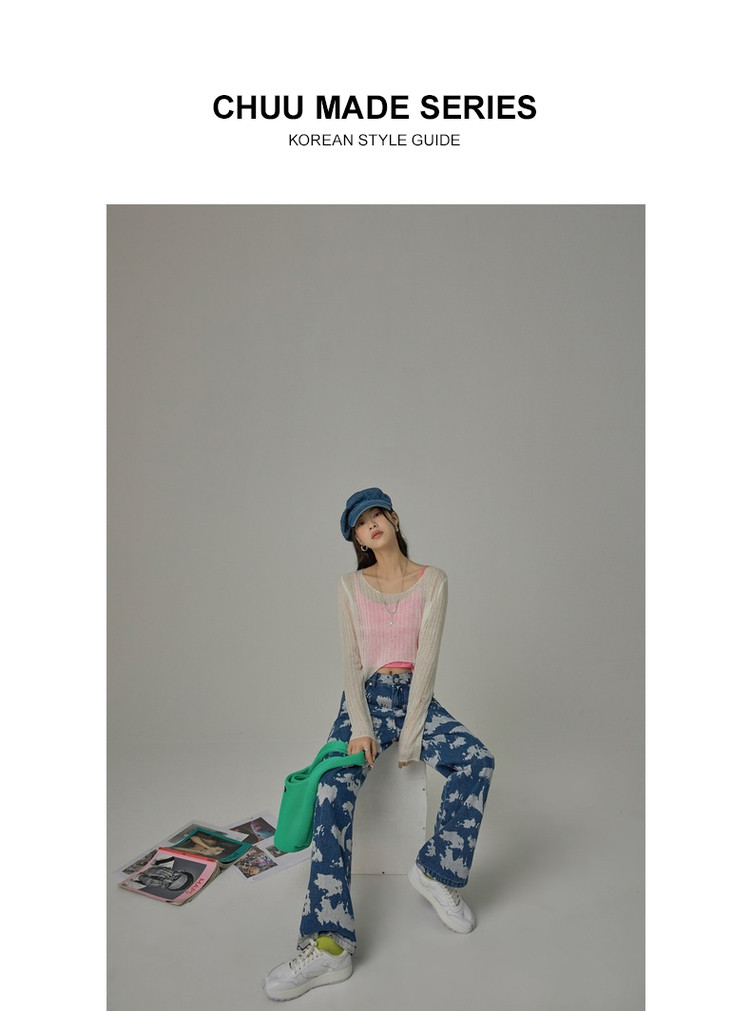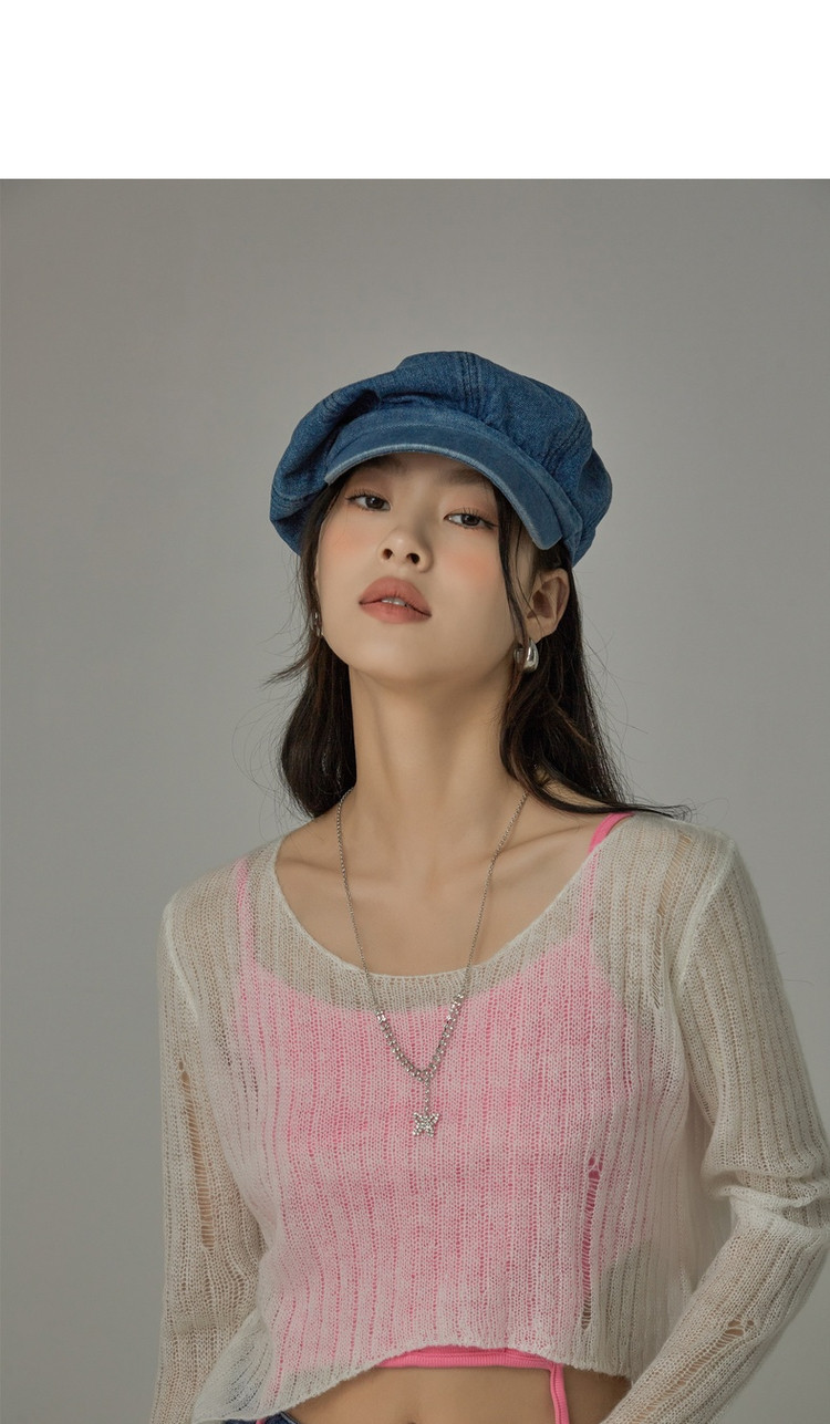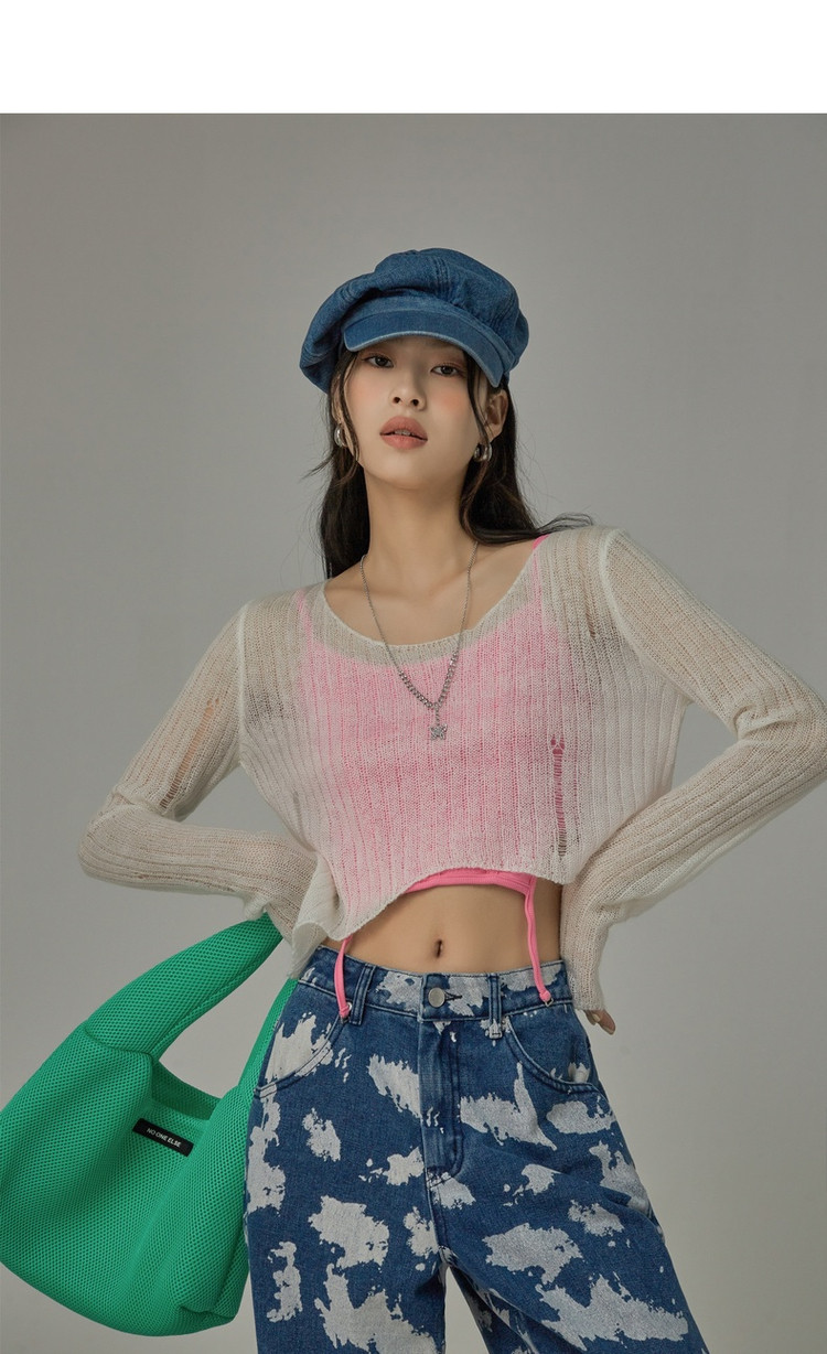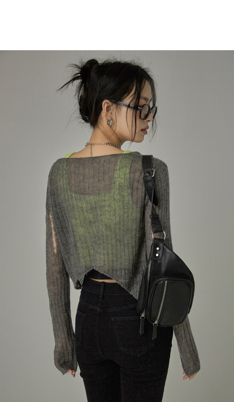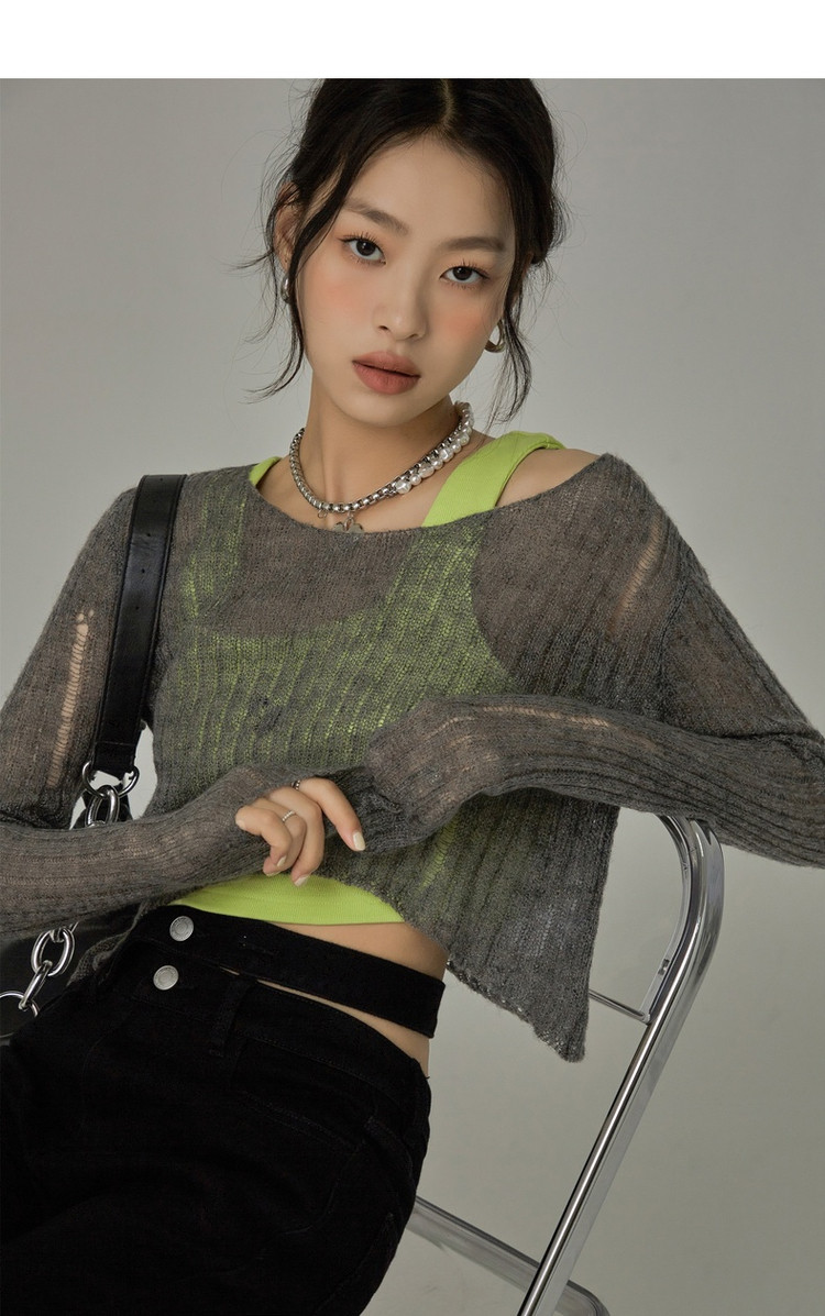 CHUU纯色透视性感针织衫女春秋薄低圆领长袖上衣 752979