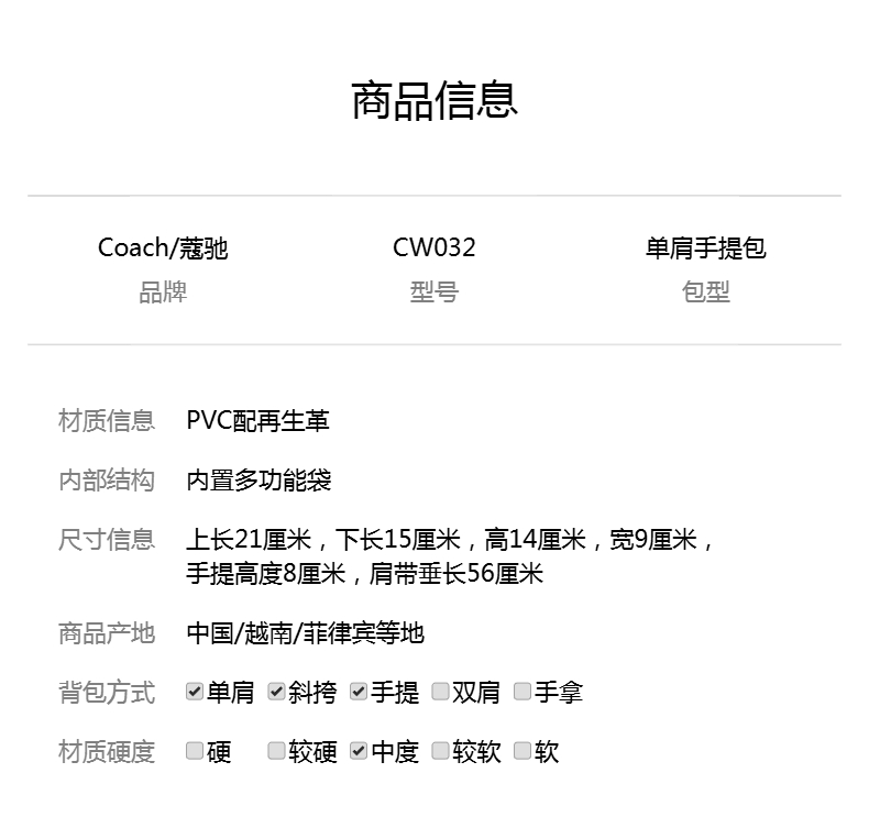 商品名称:COACH 奥莱款女士PVC单肩斜挎手提包 CW032SVPWH