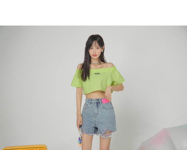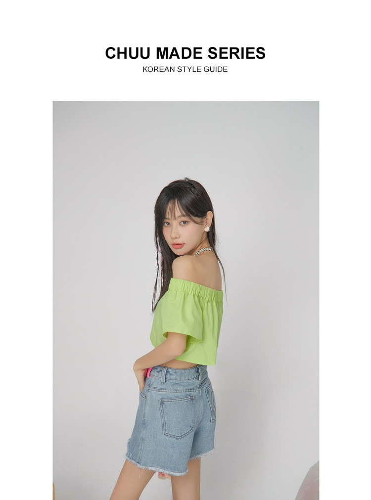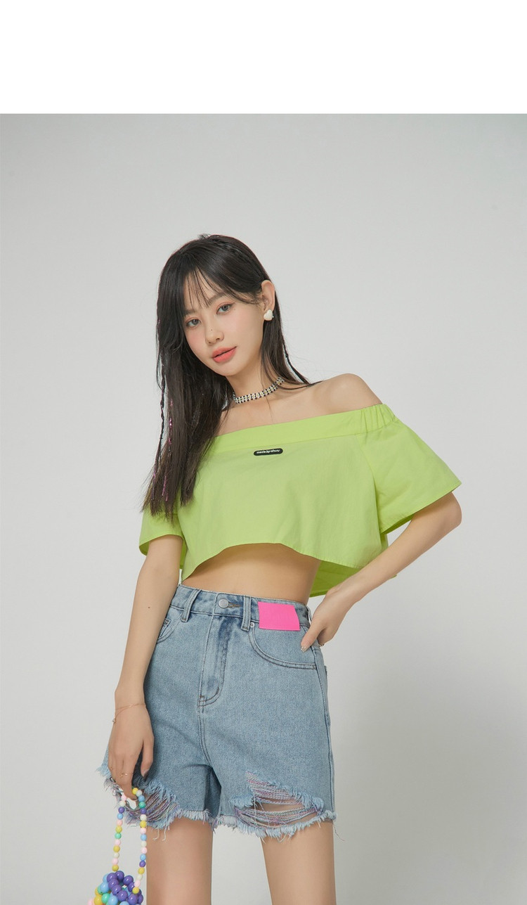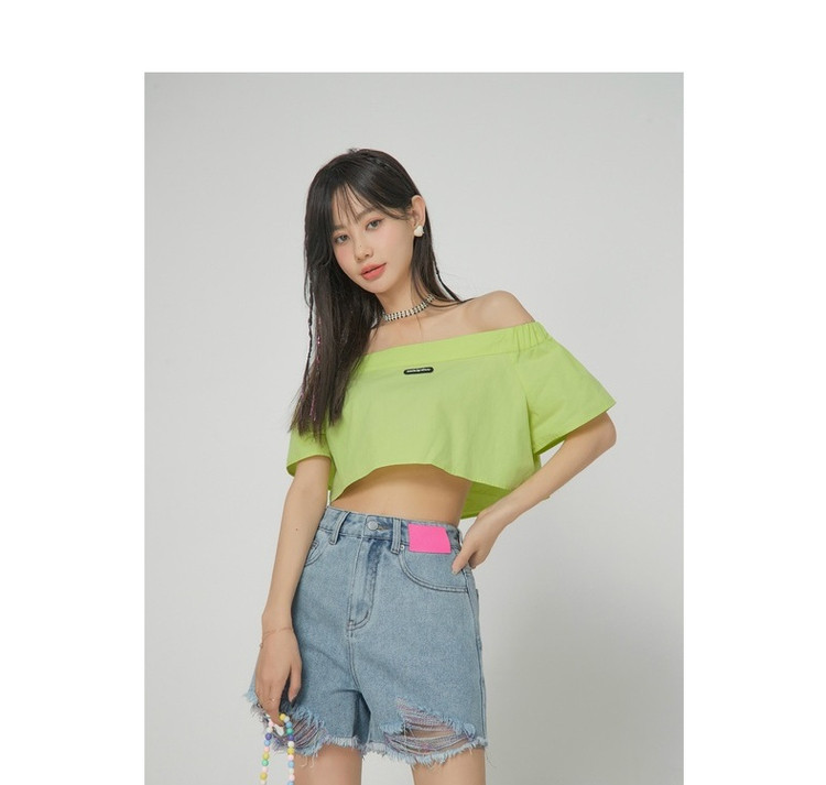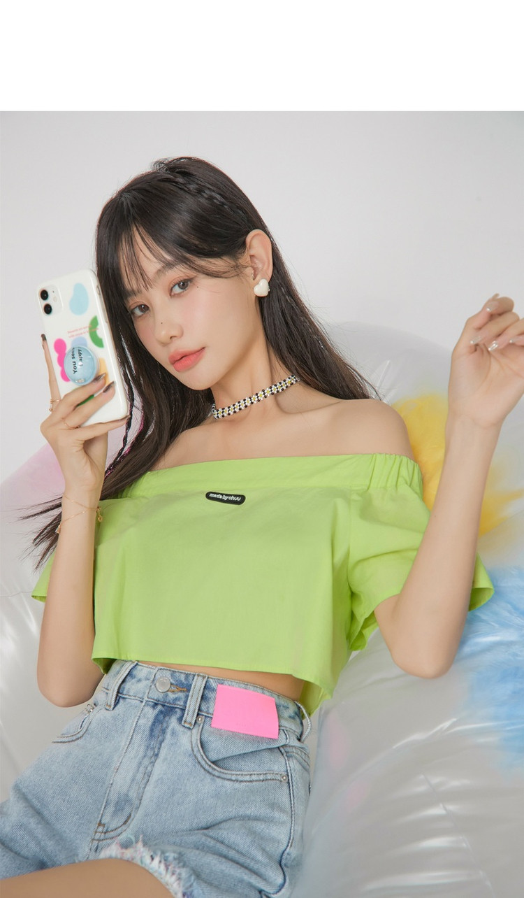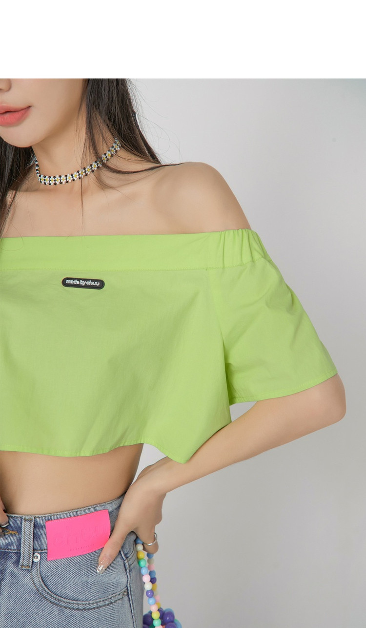 CHUU甜辣一字肩短款衬衫衫女夏贴标宽松短袖上衣 684947