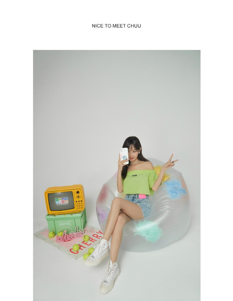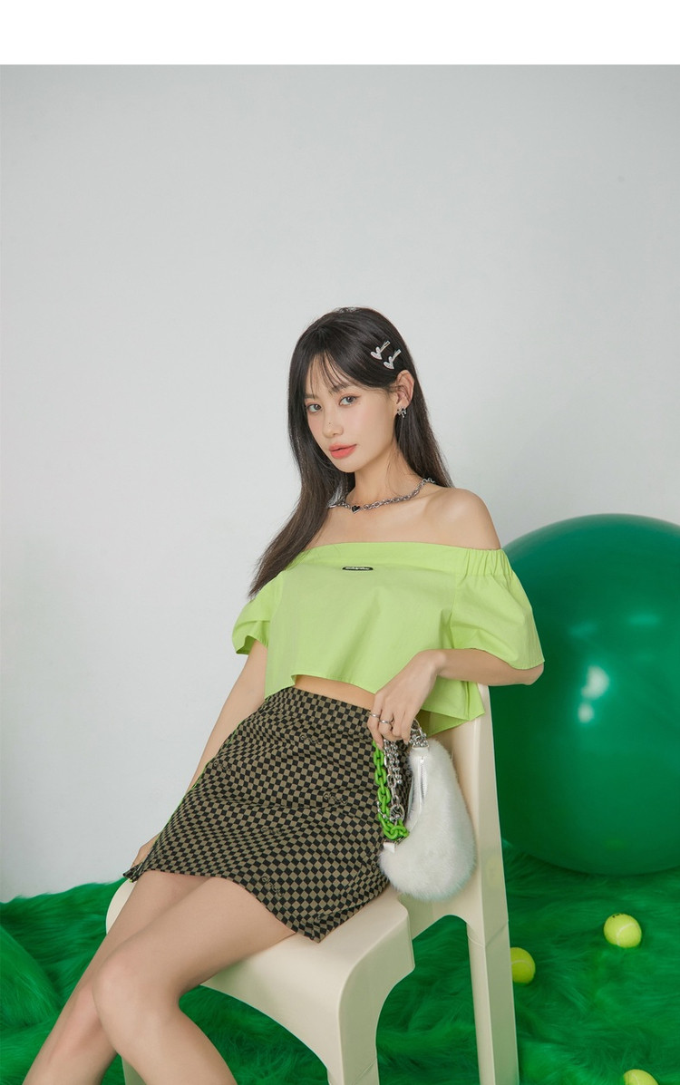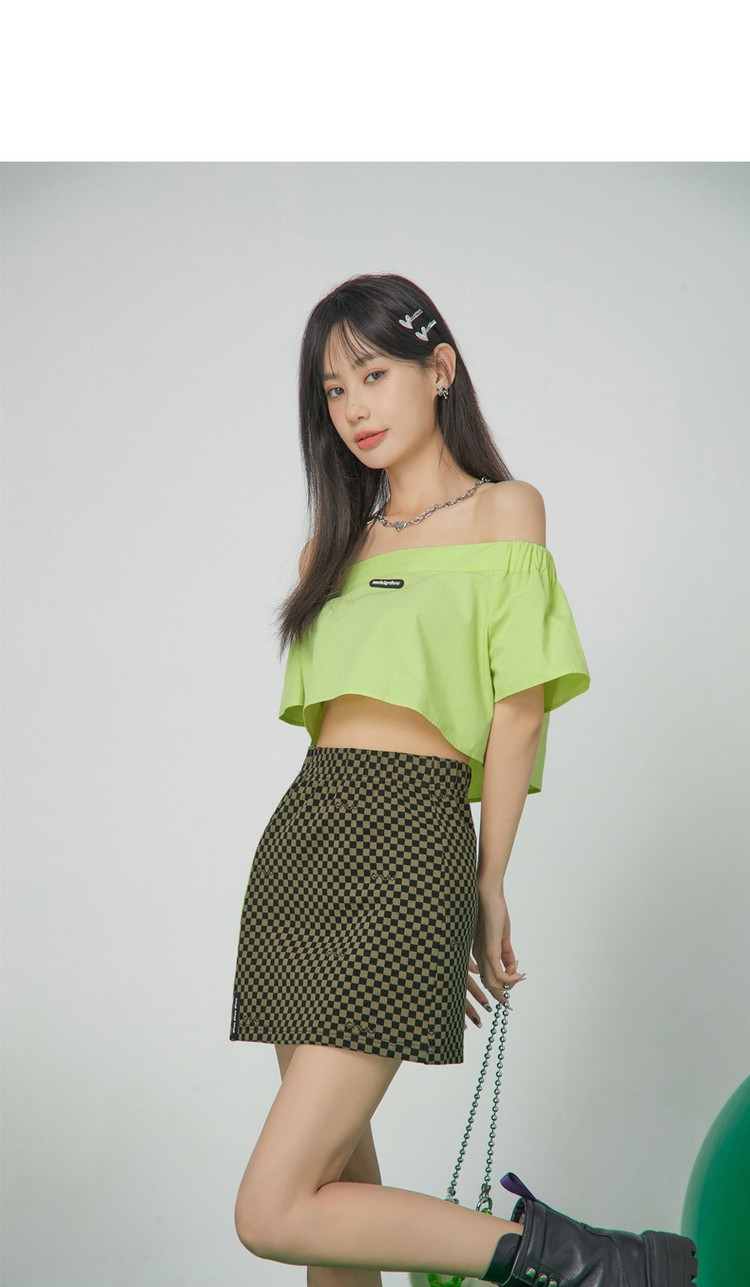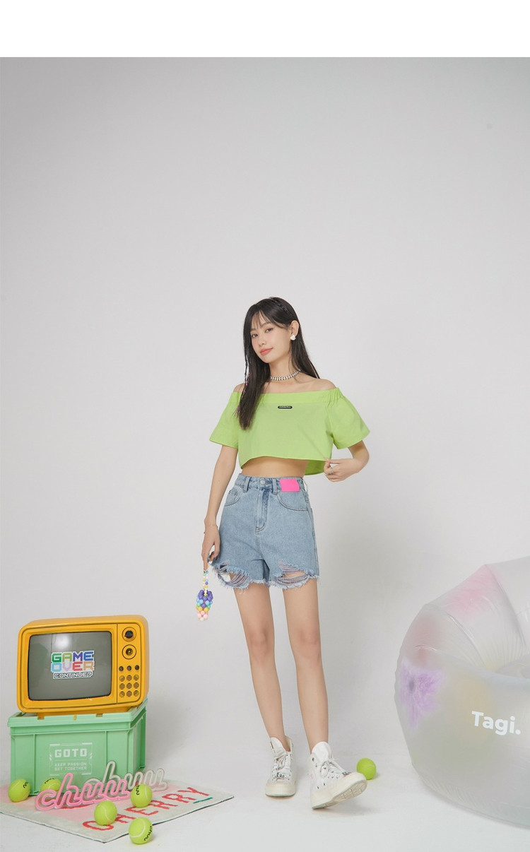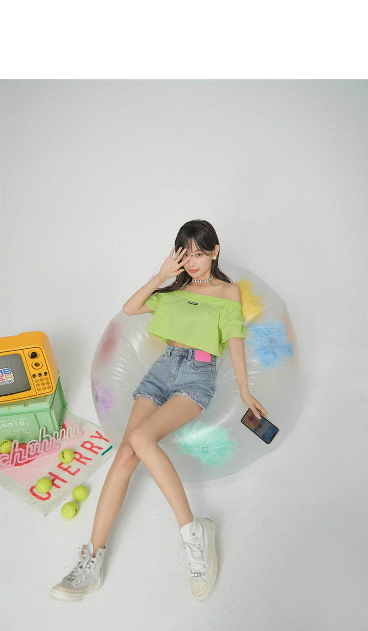 CHUU甜辣一字肩短款衬衫衫女夏贴标宽松短袖上衣 684947