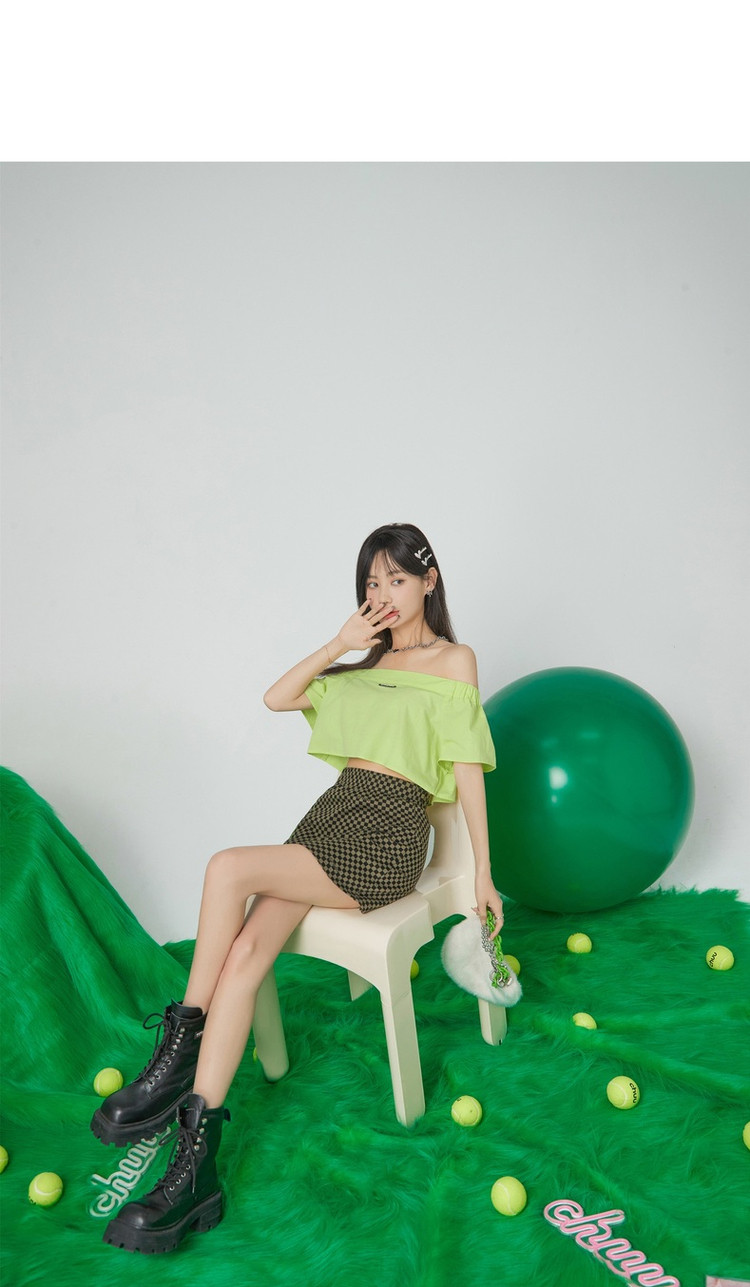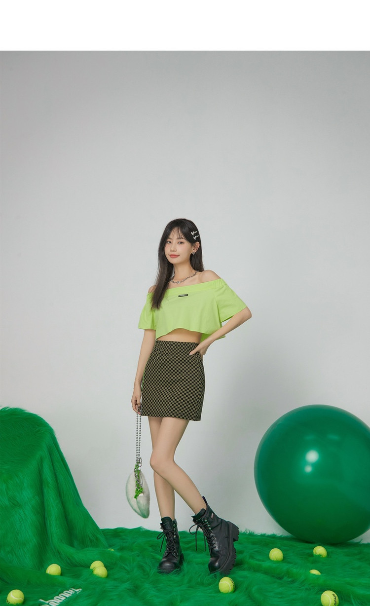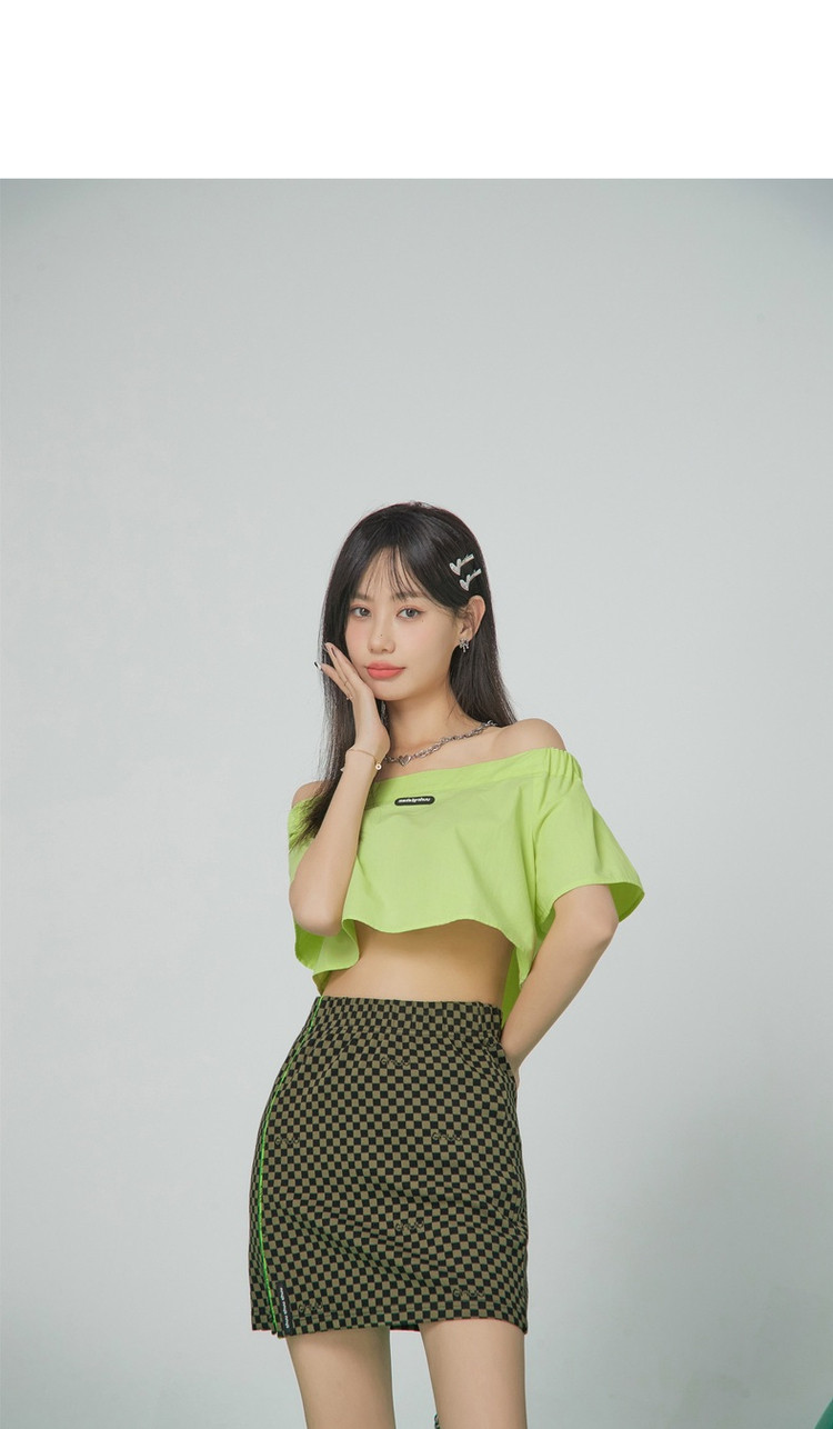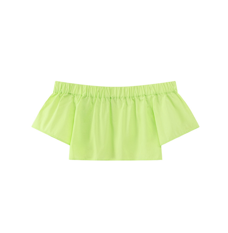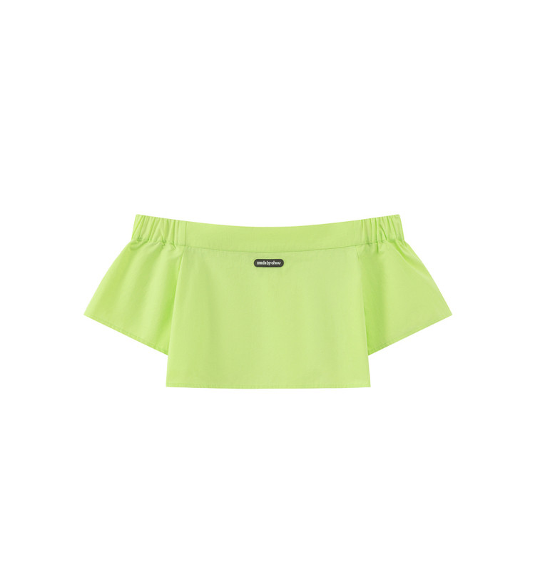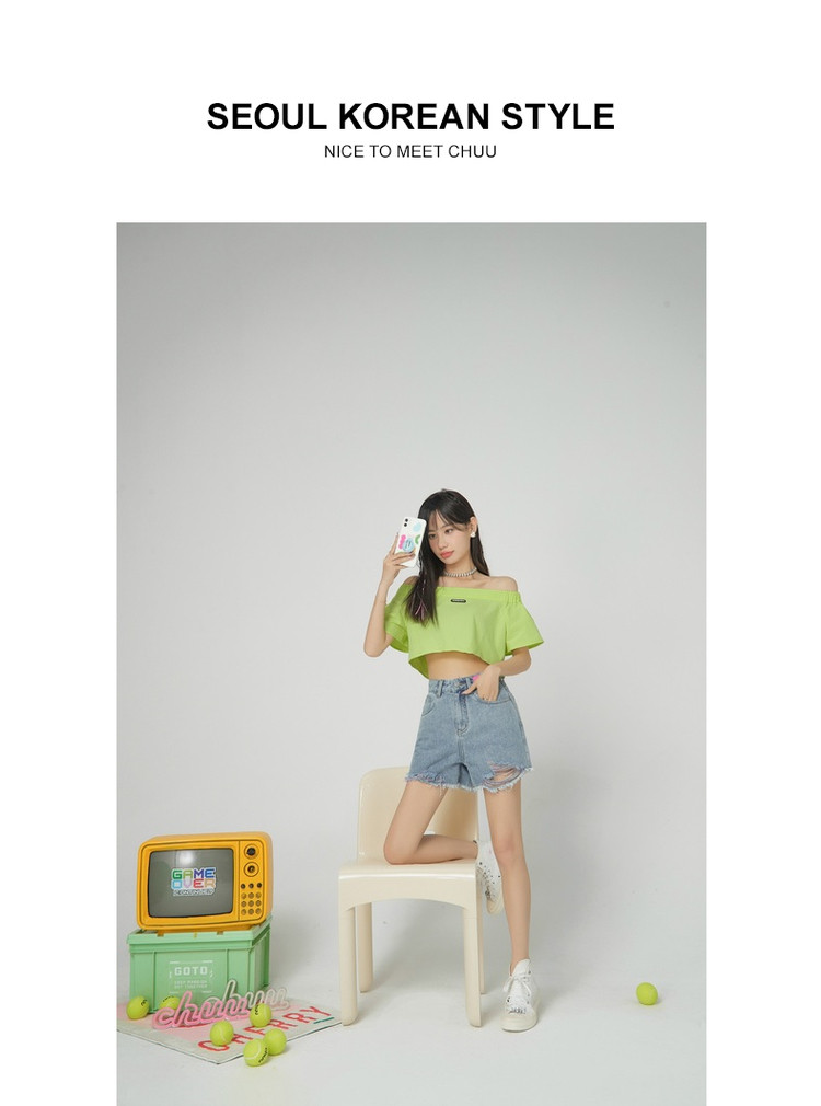 CHUU甜辣一字肩短款衬衫衫女夏贴标宽松短袖上衣 684947
