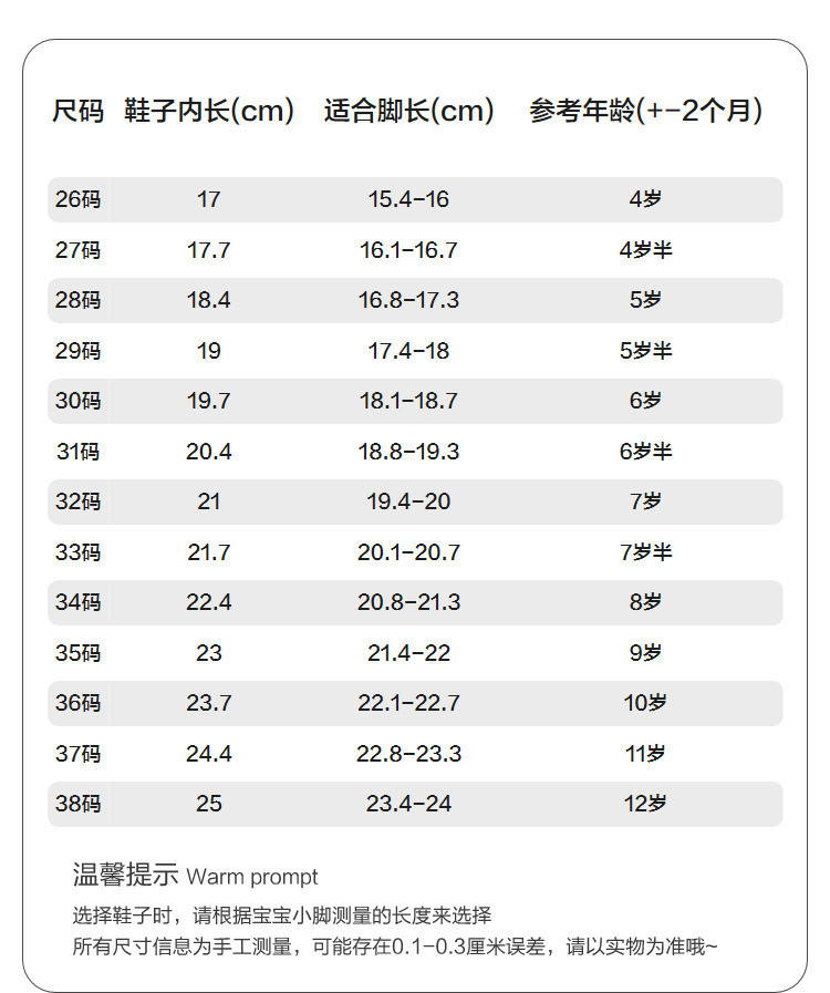 | 33码(脚长20.1/内长21.7) | 33 | 205 | 217 |