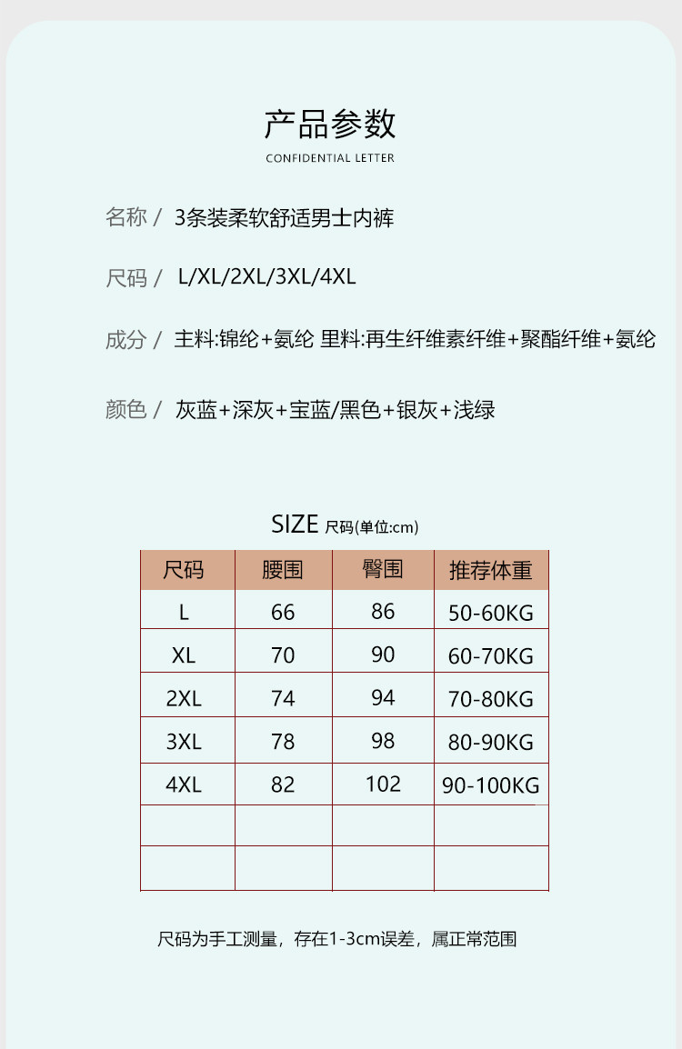 商品名称:【冰丝无痕薄内裤】柔软舒适夏天薄款平角短裤衩男士内裤3条装 841822