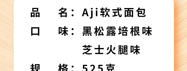 商品名称:Aji 软式面包525g/箱*3(黑松露培根味2+芝士火腿味1)
