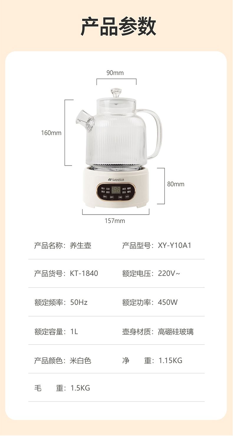 商品名称:山水(SANSUI)1L智能分体养生壶KT-1840