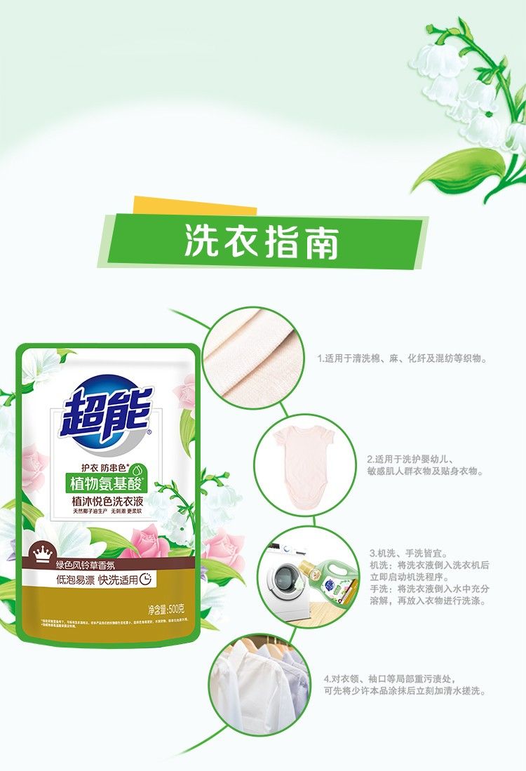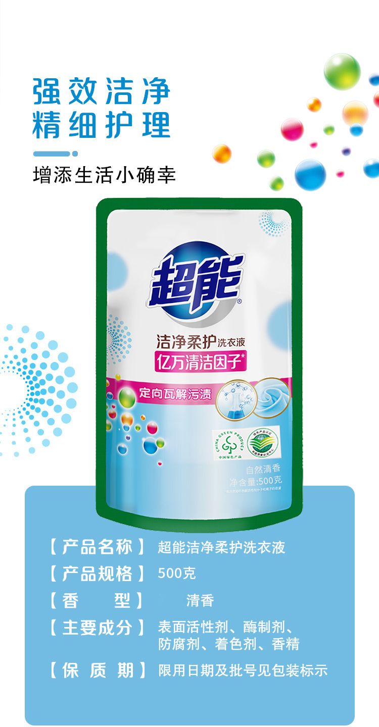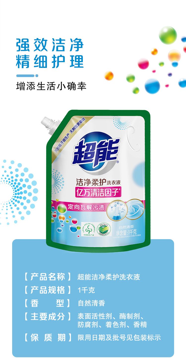 商品名称:超能 洗衣液鲜艳亮丽袋装6件套4.6斤(1kg+100gx3+500gx2)