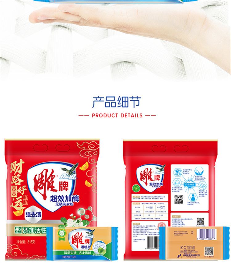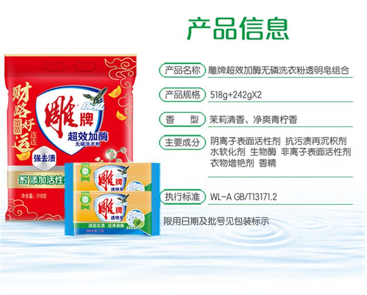 商品名称:雕牌 超效加酶洗衣粉518g+雕牌透明皂242gx2块