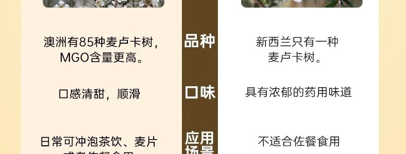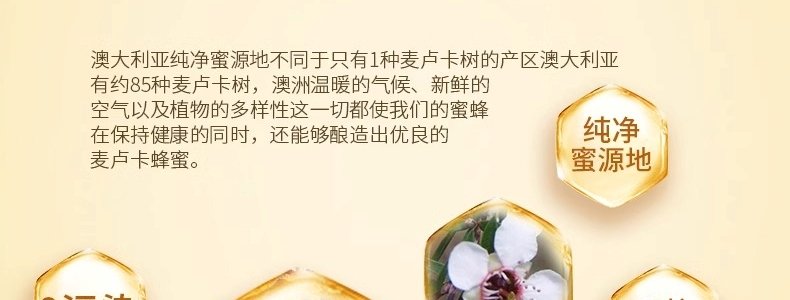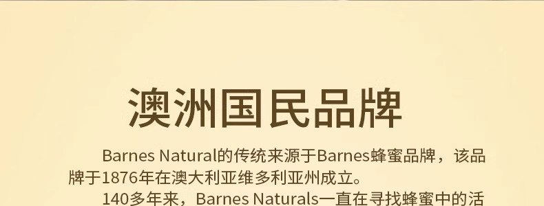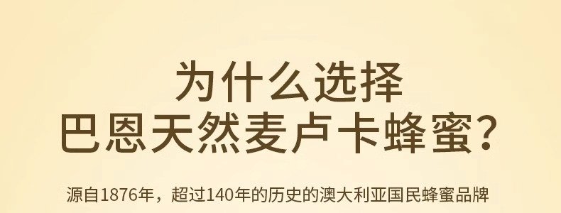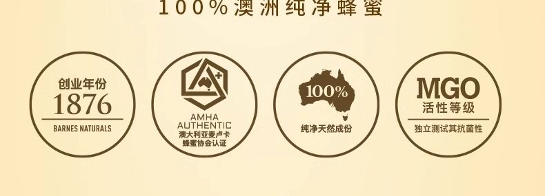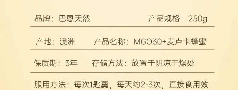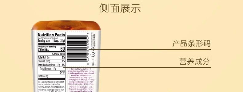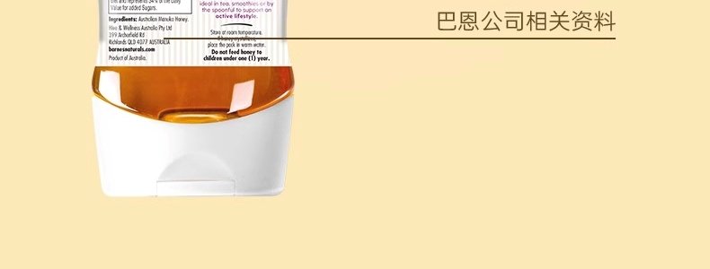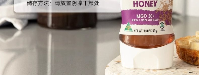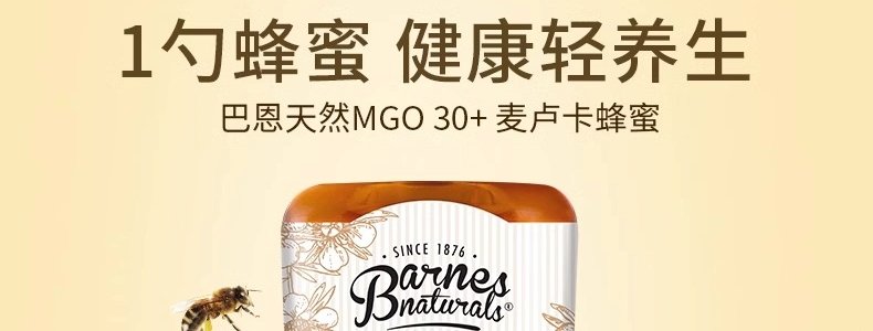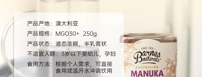 商品名称:巴恩天然 活性麦卢卡蜂蜜倒立装 MGO30+ 250g/瓶