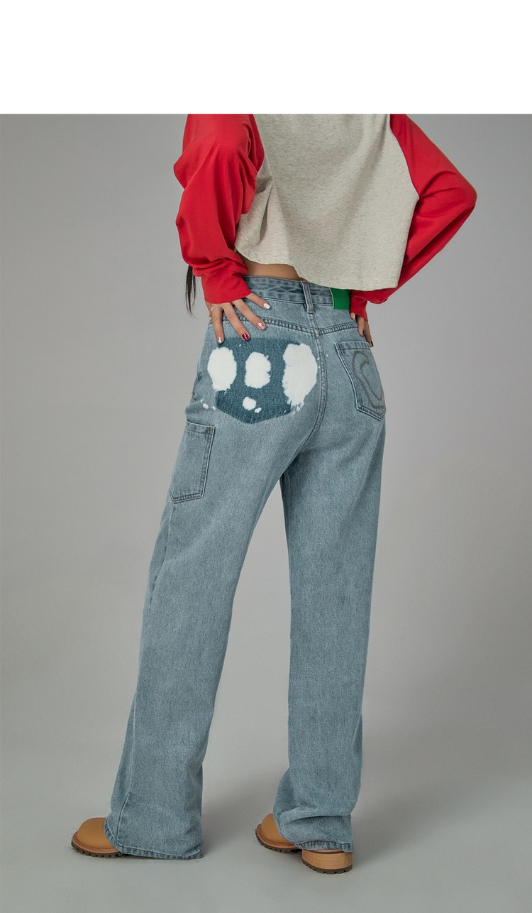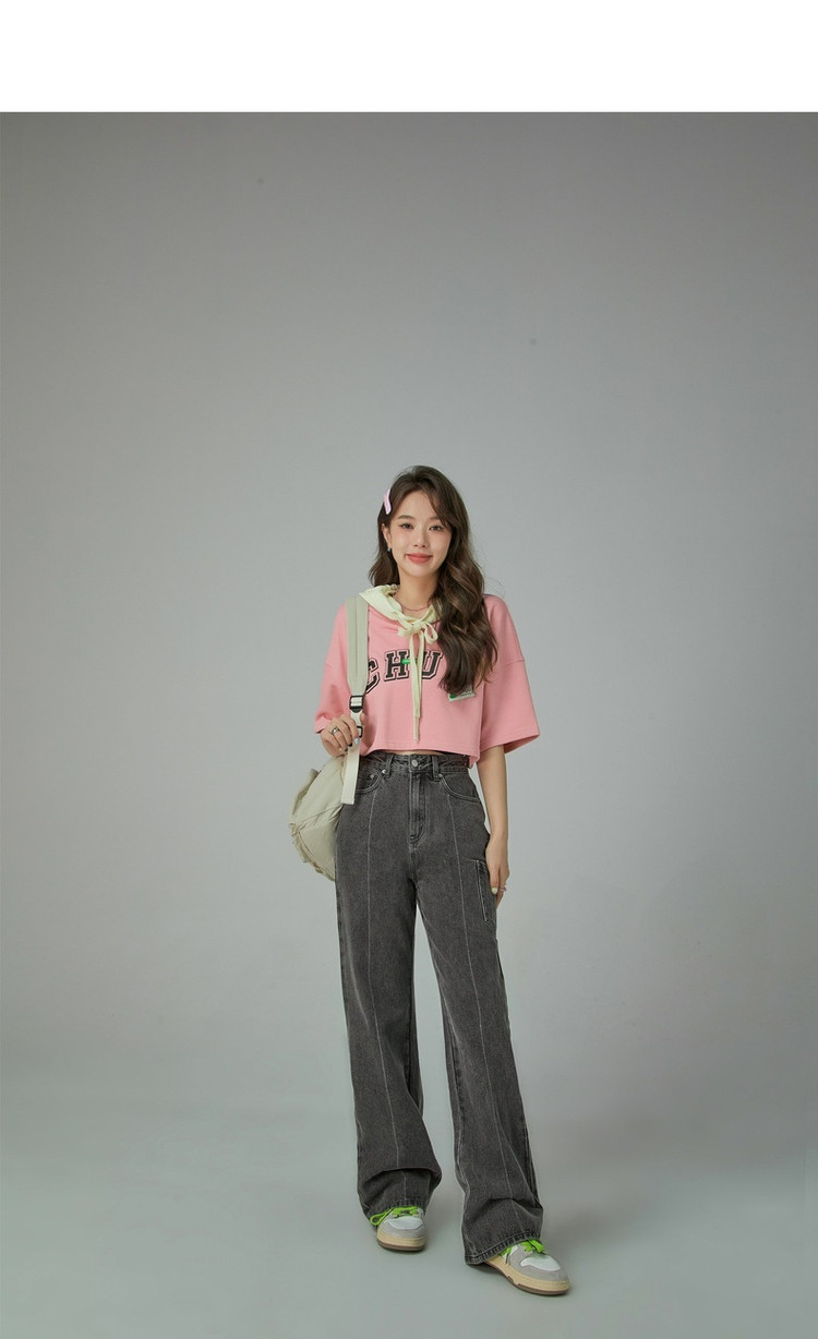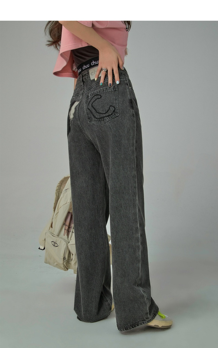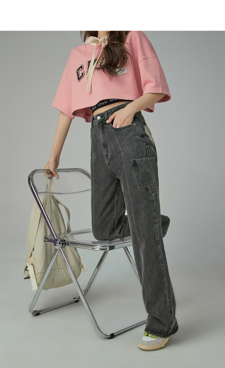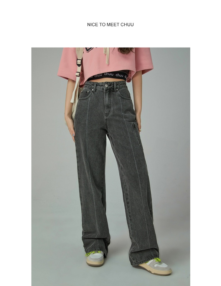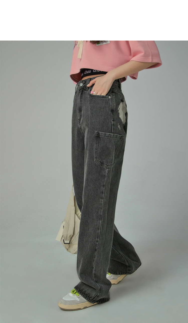 口袋高腰牛仔裤女春秋季时尚百搭纯色气质阔腿裤子潮 036563