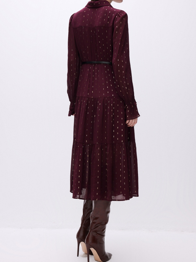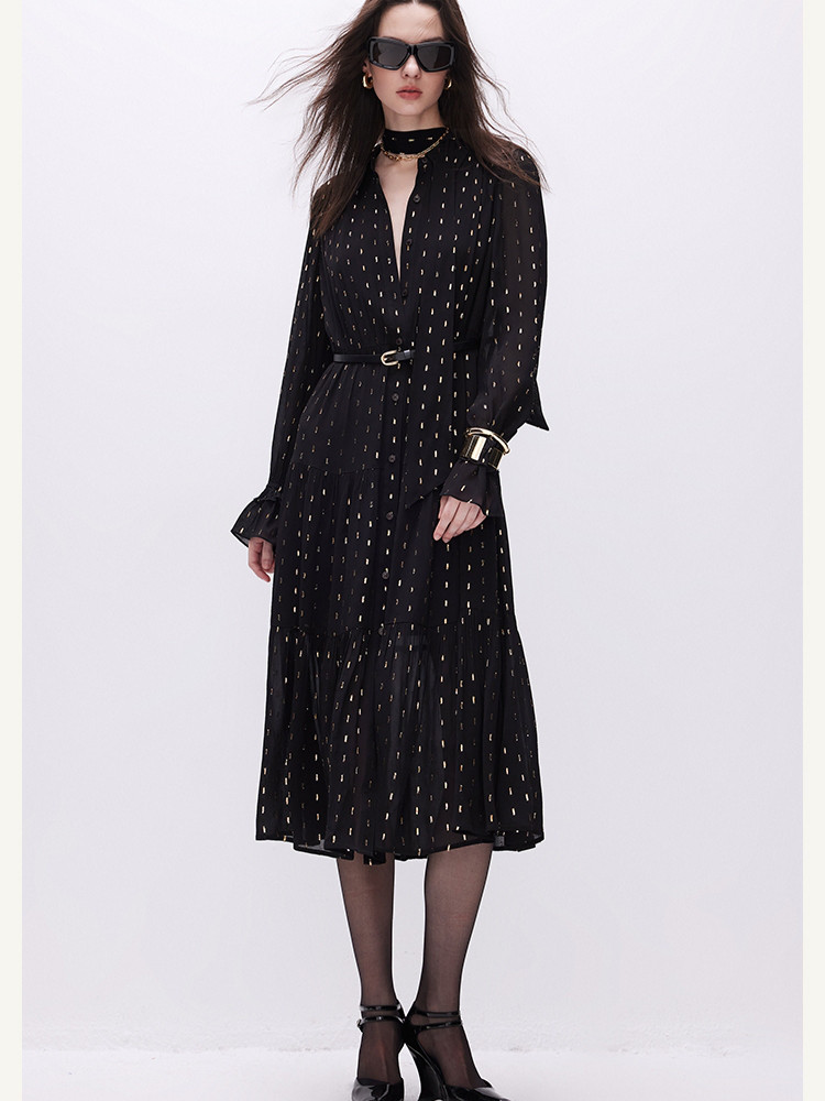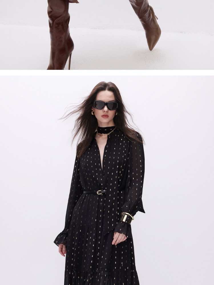【轻薄亲肤】2025春季优雅飘带中长款长袖连衣裙女 861018