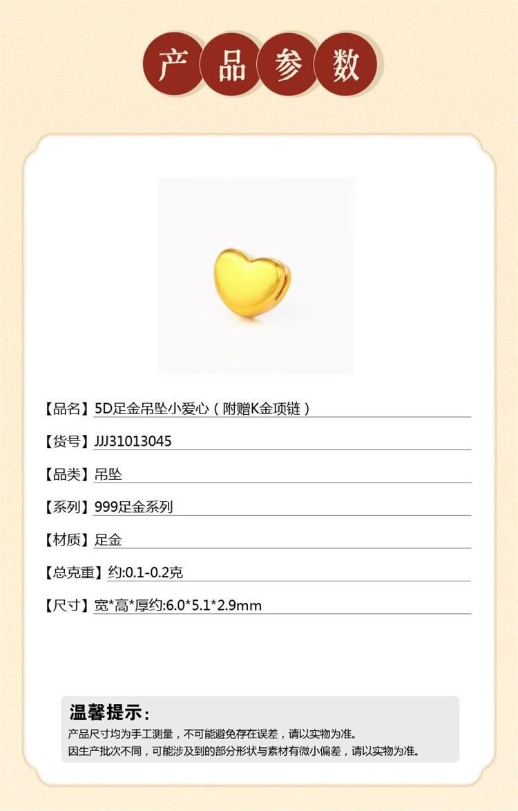 商品名称:中国金楼梵尚品5D足金吊坠小爱心(附赠K金项链)JJJ31013045送礼送生日礼物送女友(下单赠手机贴随机一个)