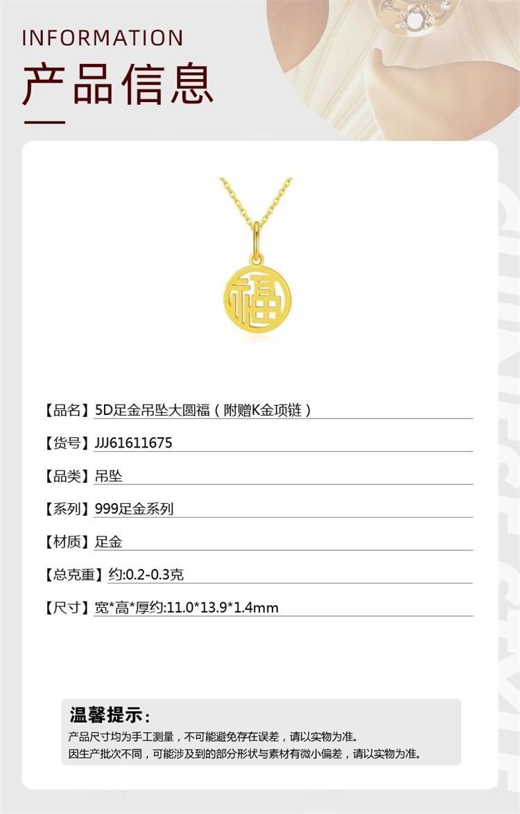 商品名称:中国金楼梵尚品5D足金吊坠大圆福送礼好物礼盒装送女友JJJ61611675(下单赠手机贴随机一个)
