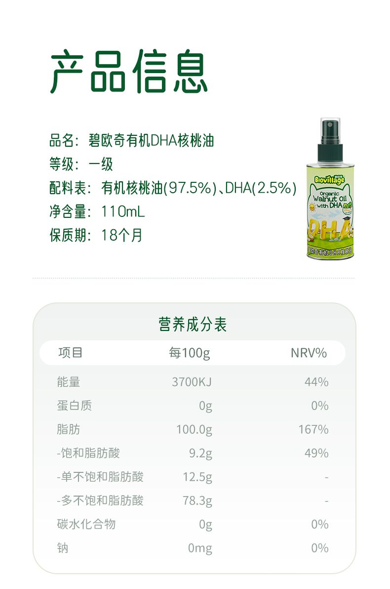 商品名称:【一餐两补】碧欧奇 有机DHA核桃油宝宝辅食油 110ml