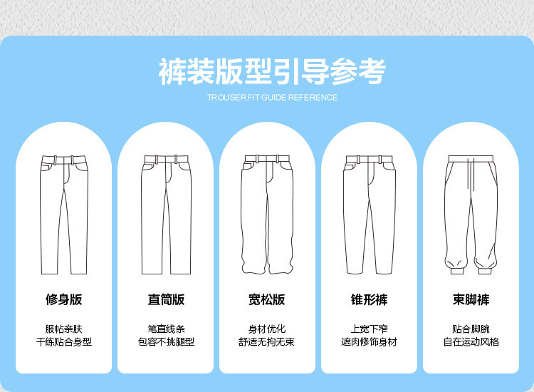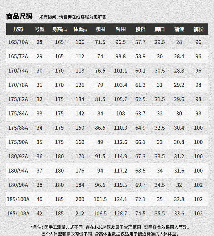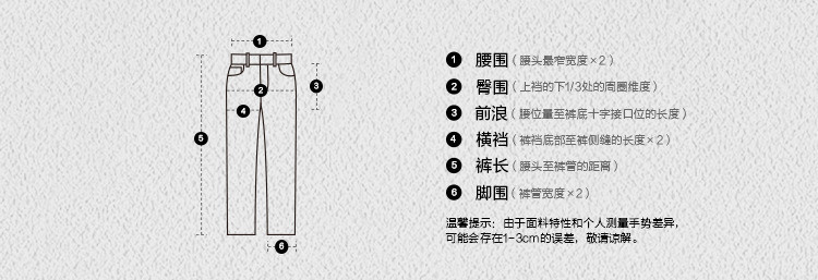 | 尺码 | 裤脚围(cm) | 腰围(cm) | 裤长(cm) | 前浪(cm) | 臀围(cm) | 号型 |