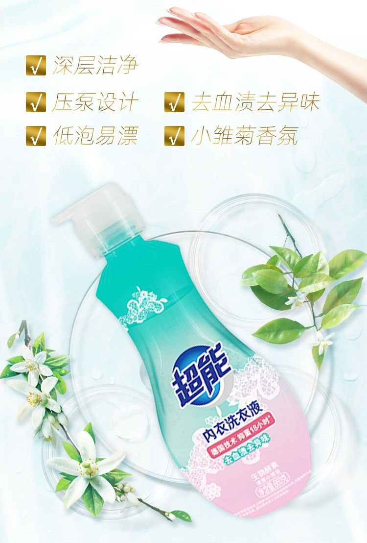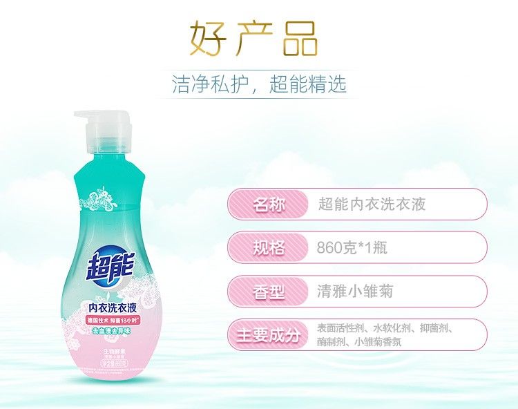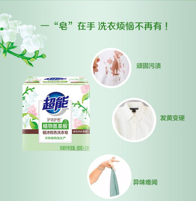 商品名称:超能 洗衣组合2220g(超能自天然洗衣液(带出液口)500g*2+超能内衣洗衣液860g+超能植沐悦色洗衣皂180g*