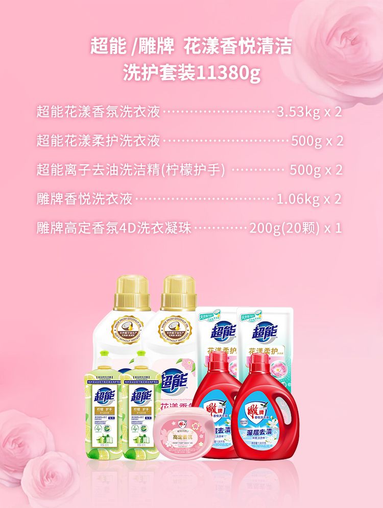 商品名称:超能 /雕牌 花漾香悦清洁洗护套装11380g(超能花漾香氛洗衣液3.53kg(2瓶)+超能花漾柔护洗衣液500g*2+