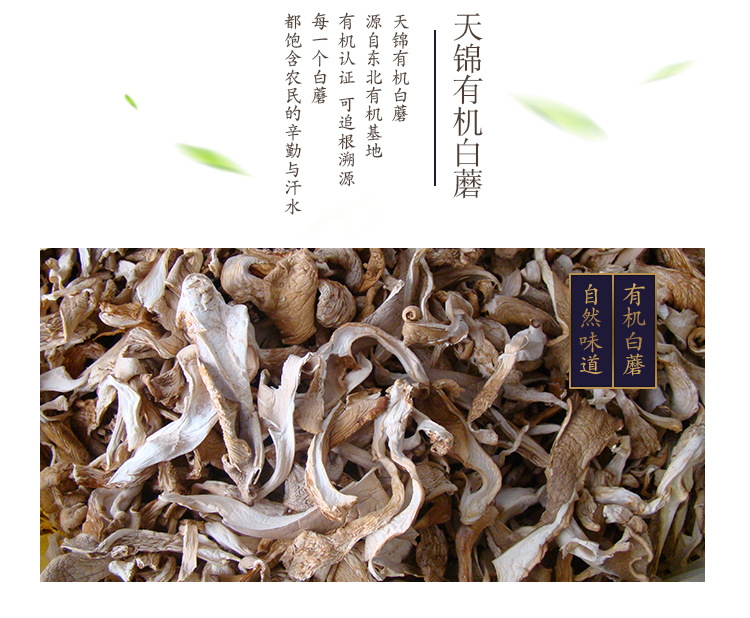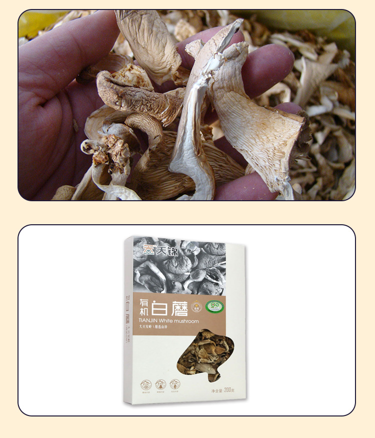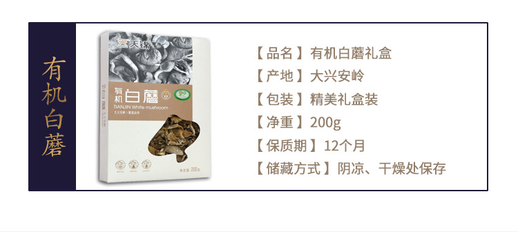 产品规格:天锦有机白蘑单盒装200g*2盒