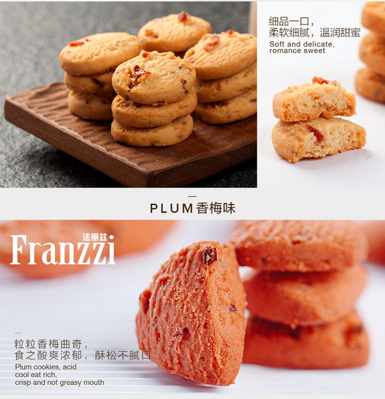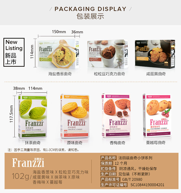 商品名称:Franzzi/法丽兹曲奇饼干蔓越莓味102g*2盒+抹茶味102g*2盒+原味102g*2盒