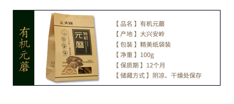 产品规格:天锦有机元蘑纸袋装100g*2袋