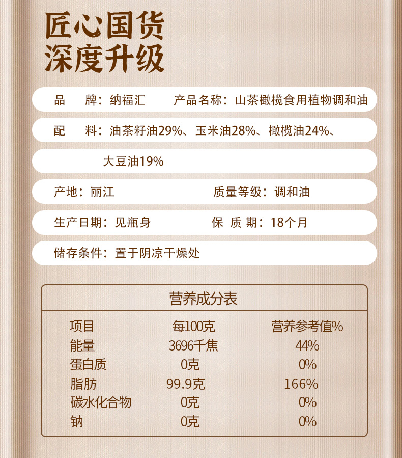 商品名称:纳福汇山茶橄榄食用植物调和油礼盒1.5L*2瓶