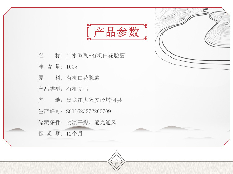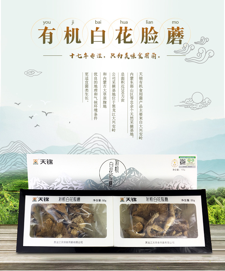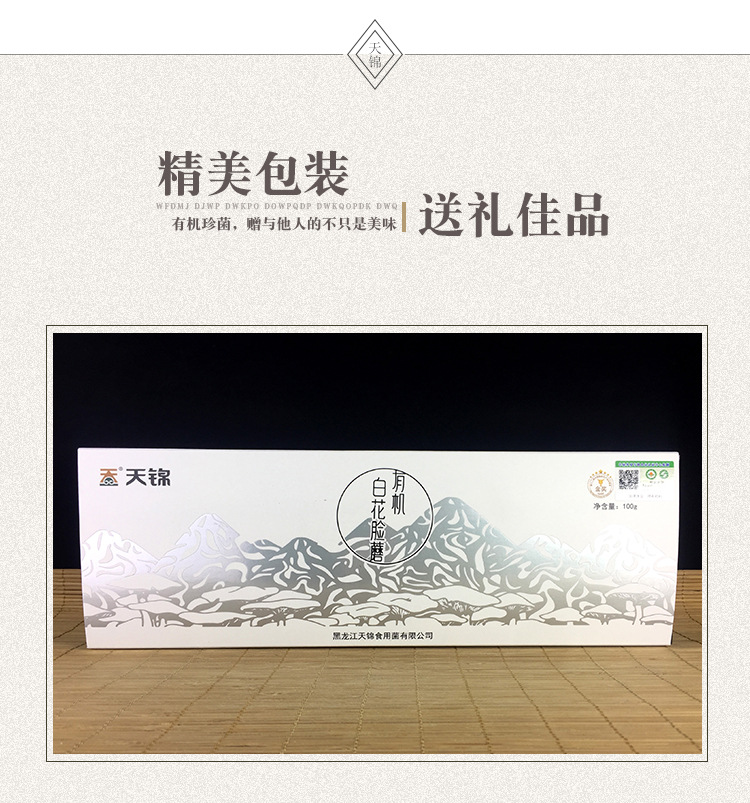 商品名称:天锦山水系列有机白花脸蘑礼盒100g