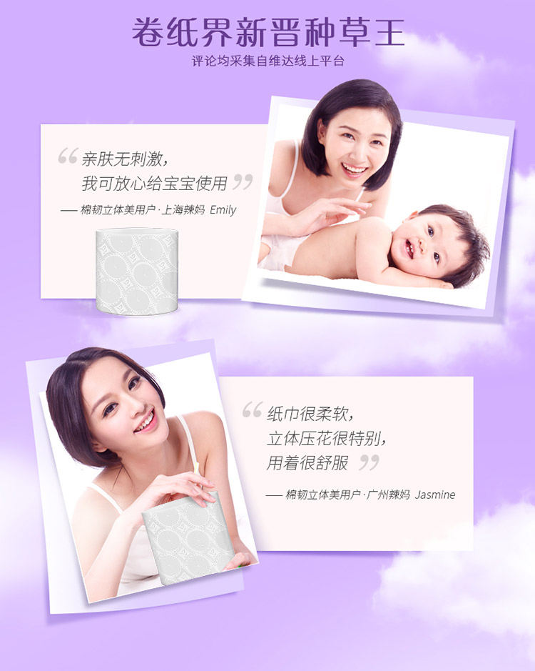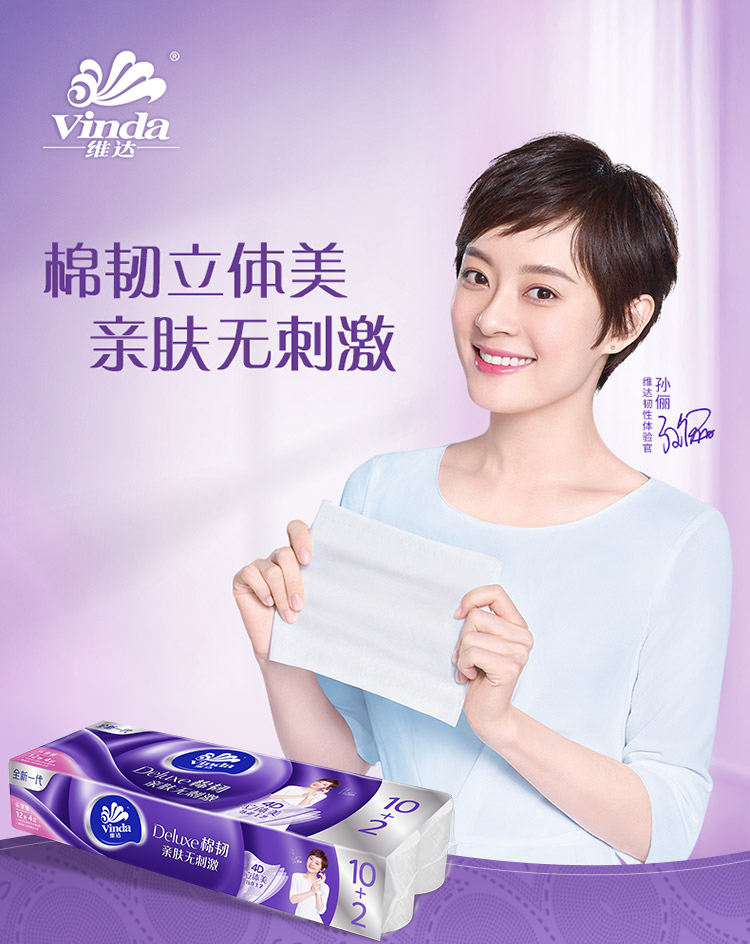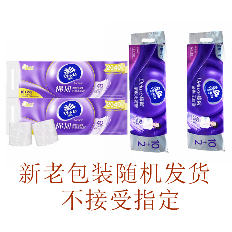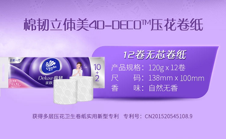 商品名称:Vinda/维达棉韧立体美四层压花无芯卷纸120g*12卷*2提