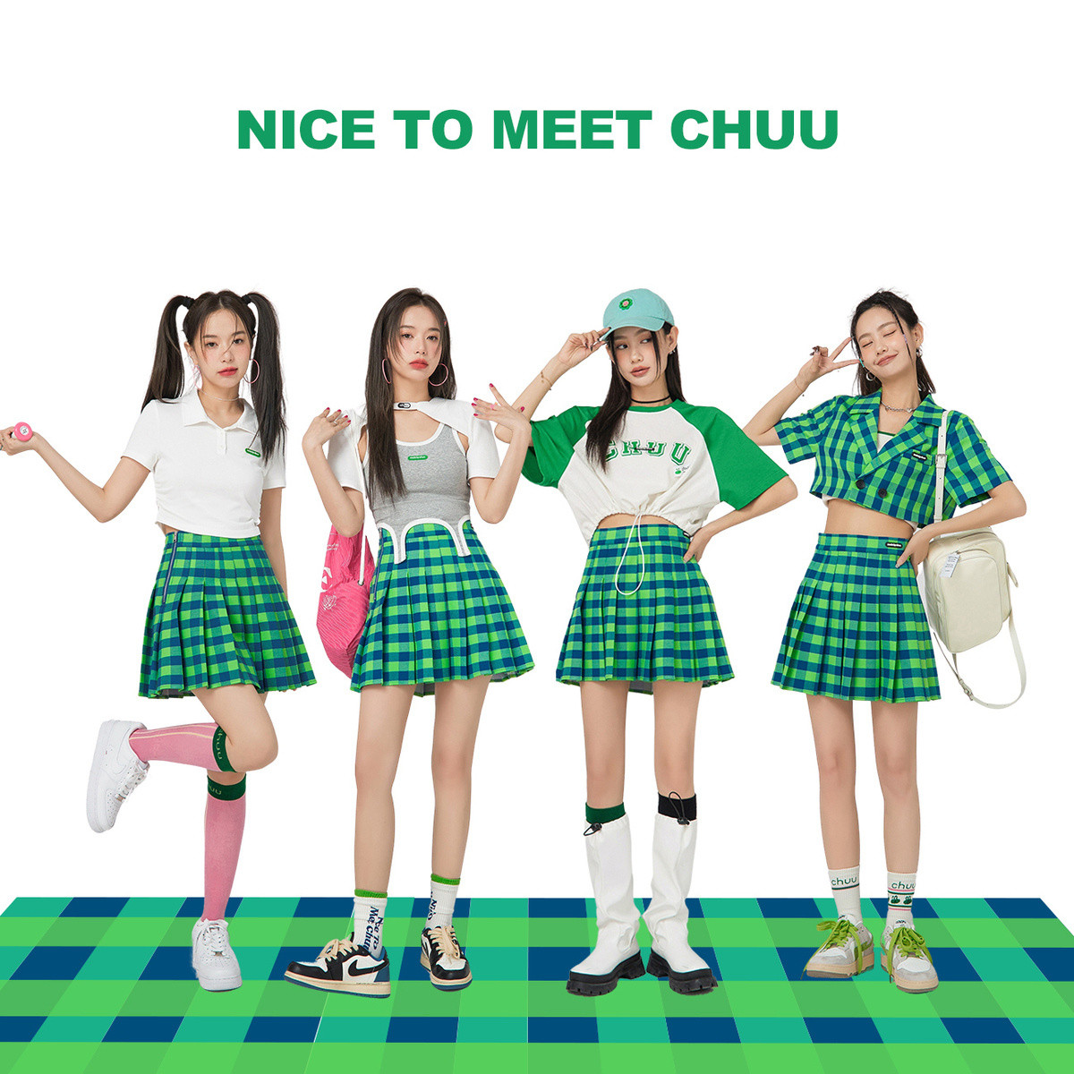CHUU时尚格纹高腰百褶半身裙女春夏秋学院风短裙 927699