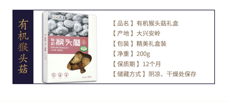 商品名称:天锦有机猴头菇单盒装200g*2盒