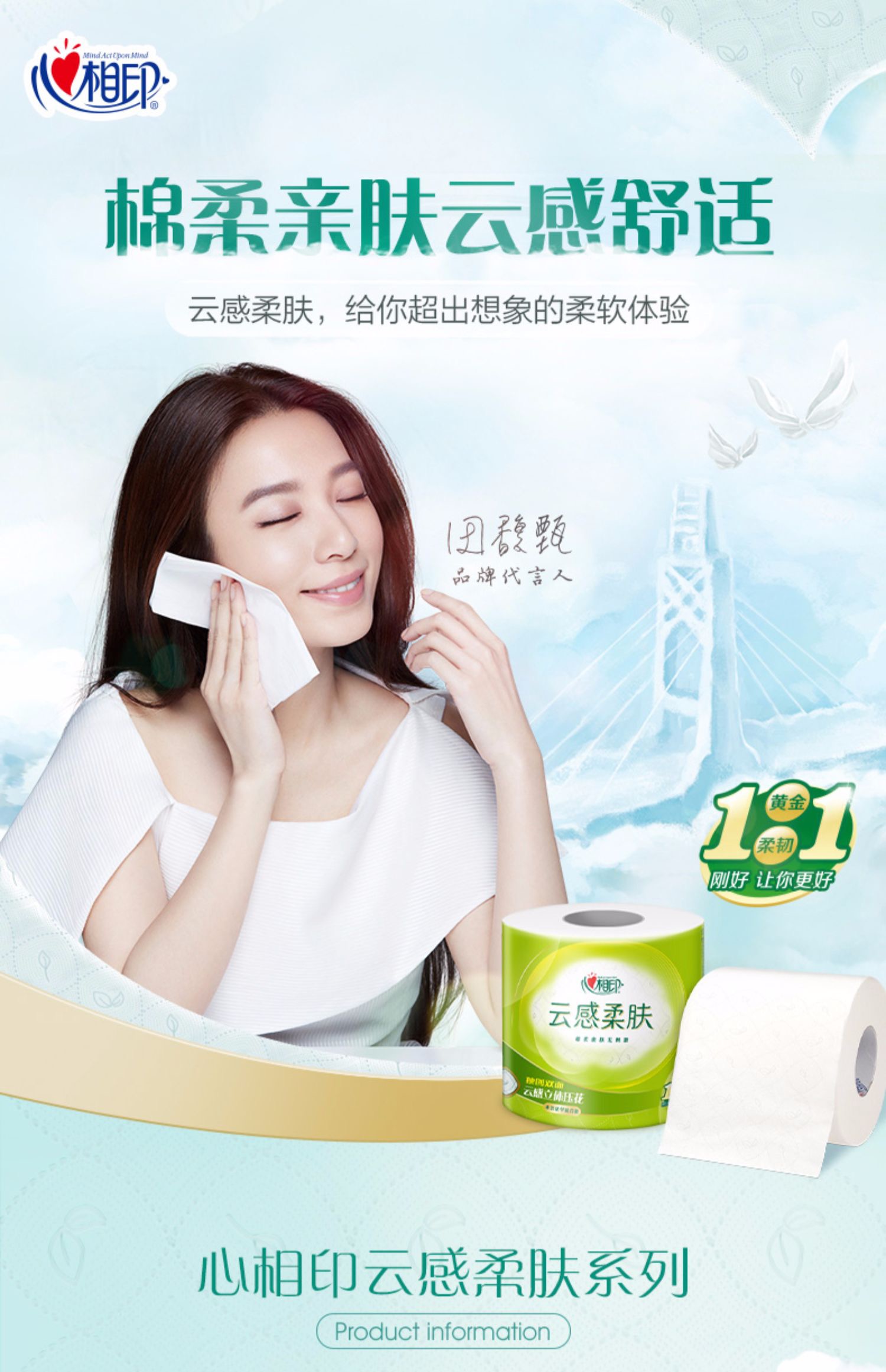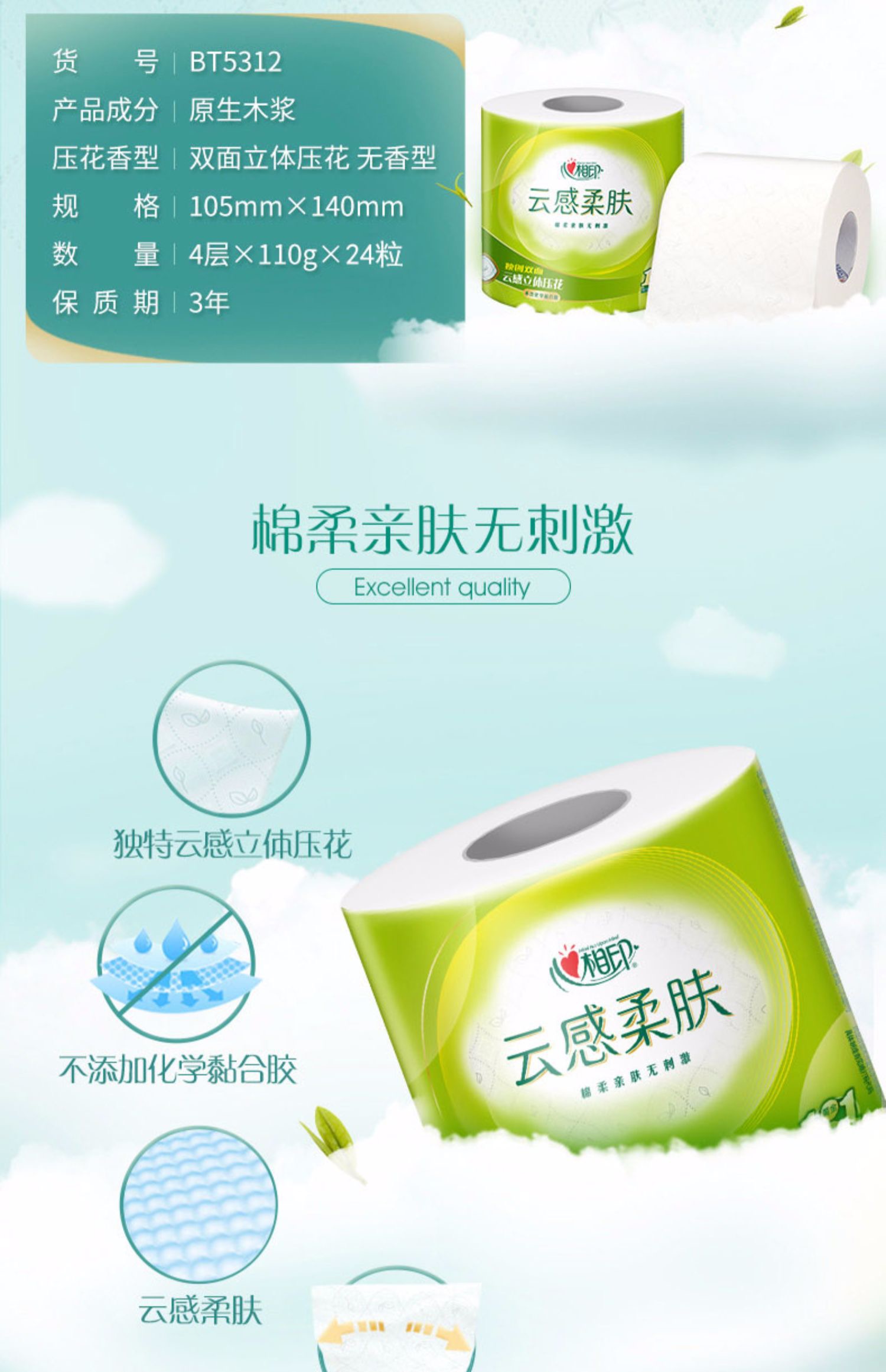 商品名称:心相印云感柔肤四层立体压花无香有芯卫生卷纸110g*12卷*2提