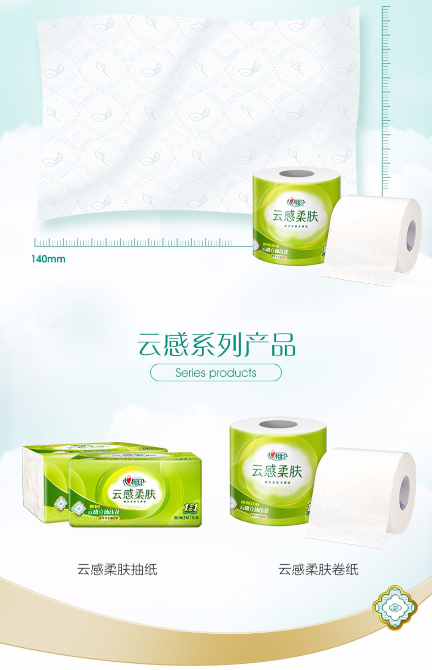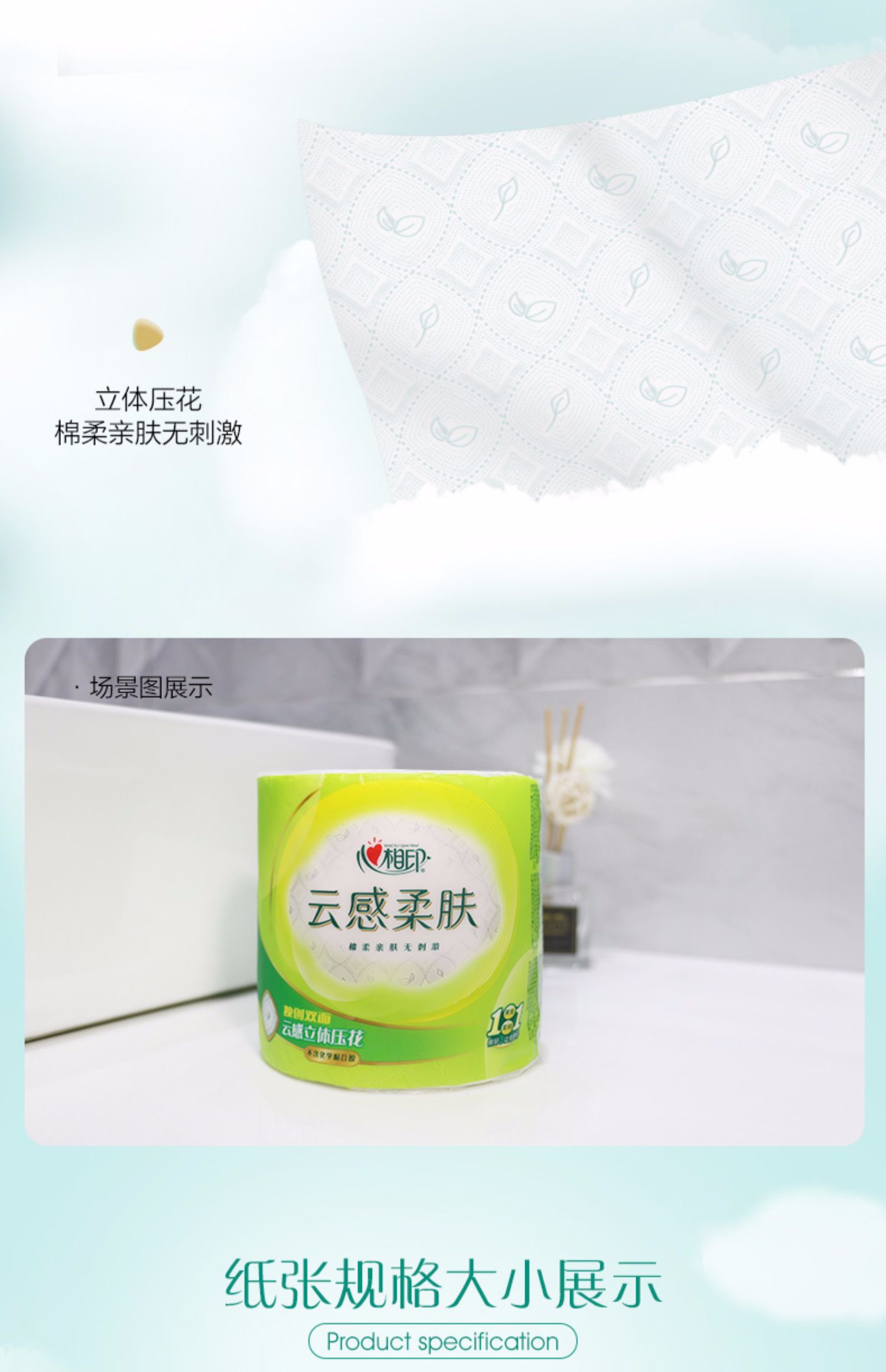 心相印云感柔肤四层立体压花无香有芯卫生卷纸110g*12卷*2提