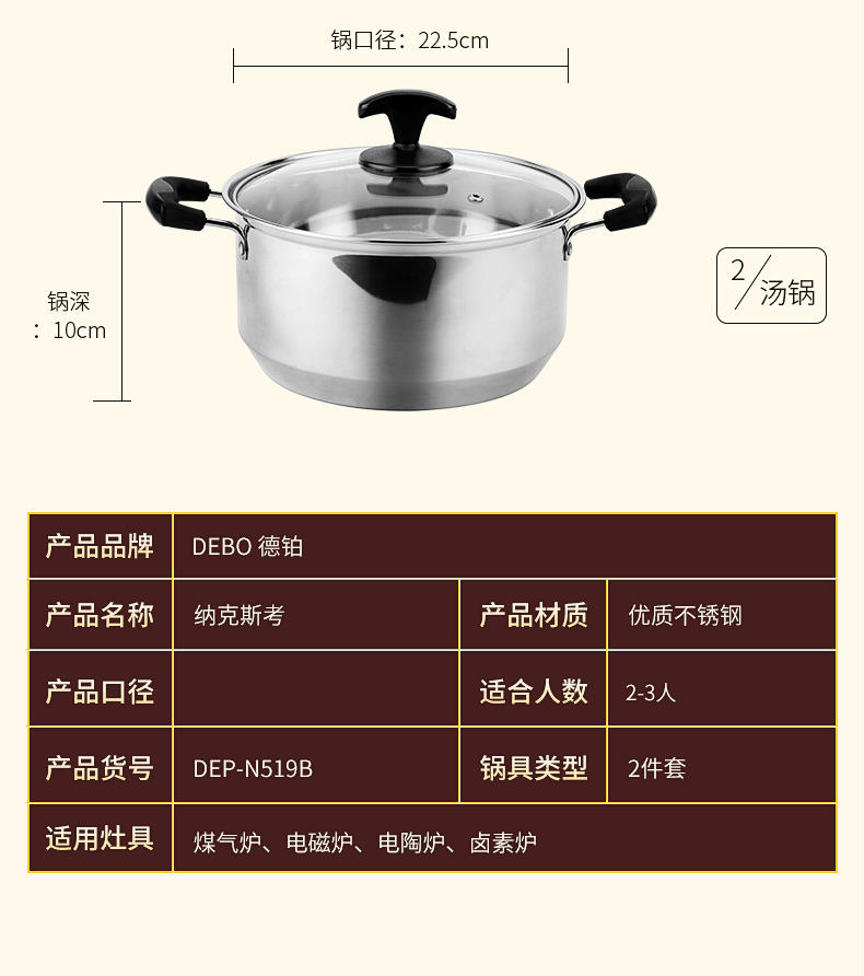 商品名称:Debo/德铂纳克斯考不锈钢锅具2件套DEP-519