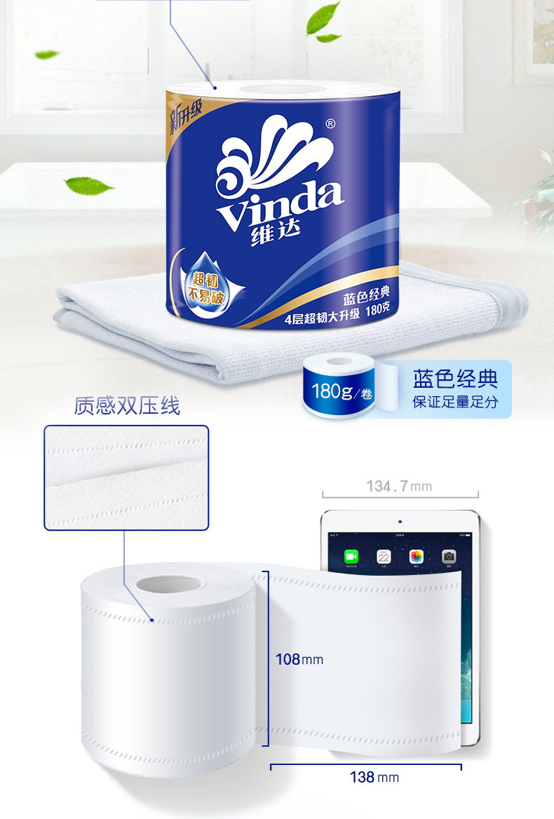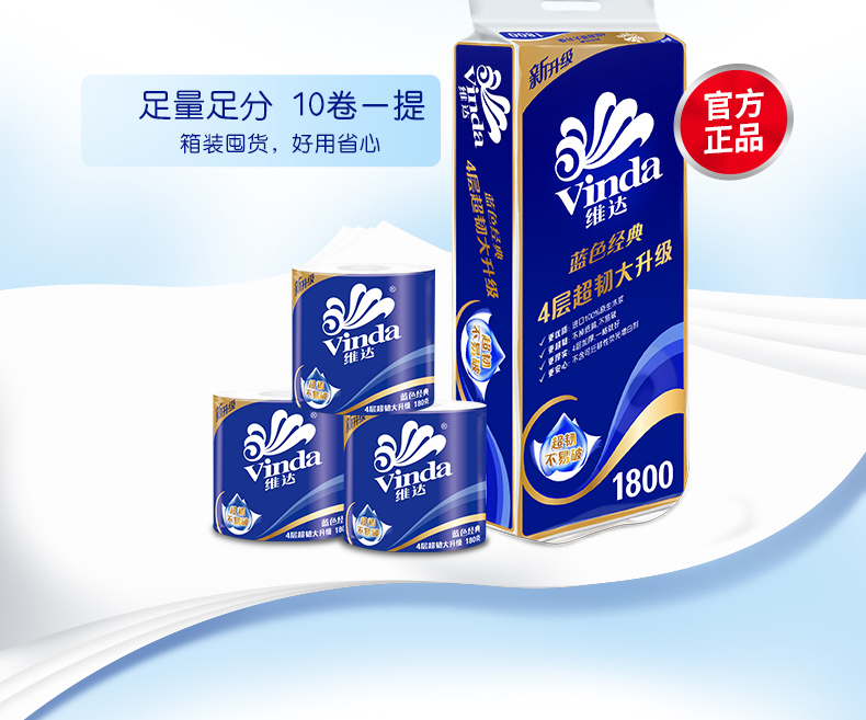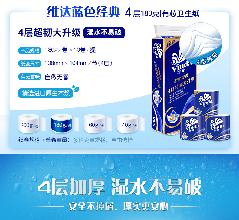 商品名称:Vinda/维达超韧四层有芯卷纸180g*10卷*2提