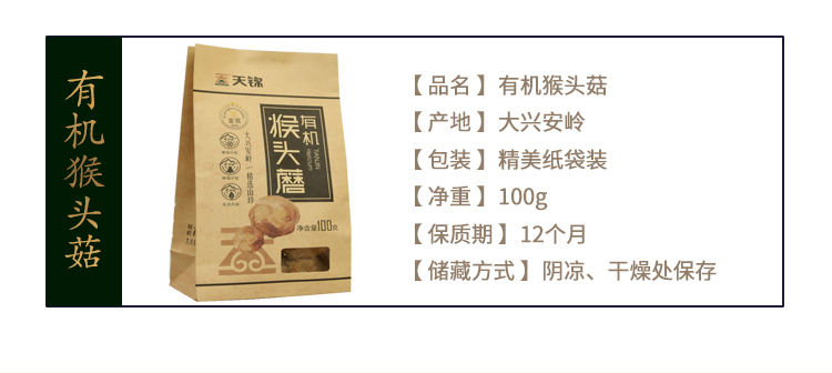 商品名称:天锦有机猴头蘑纸袋装100g*2袋