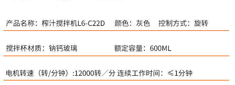 商品名称:Joyoung/九阳600毫升榨汁搅拌机-灰色L6-C22D