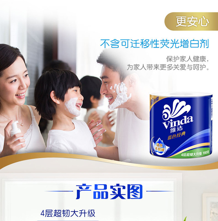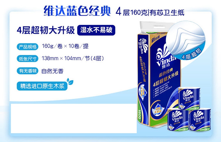商品名称:Vinda/维达蓝色经典四层超韧有芯卷纸160克10卷*2提