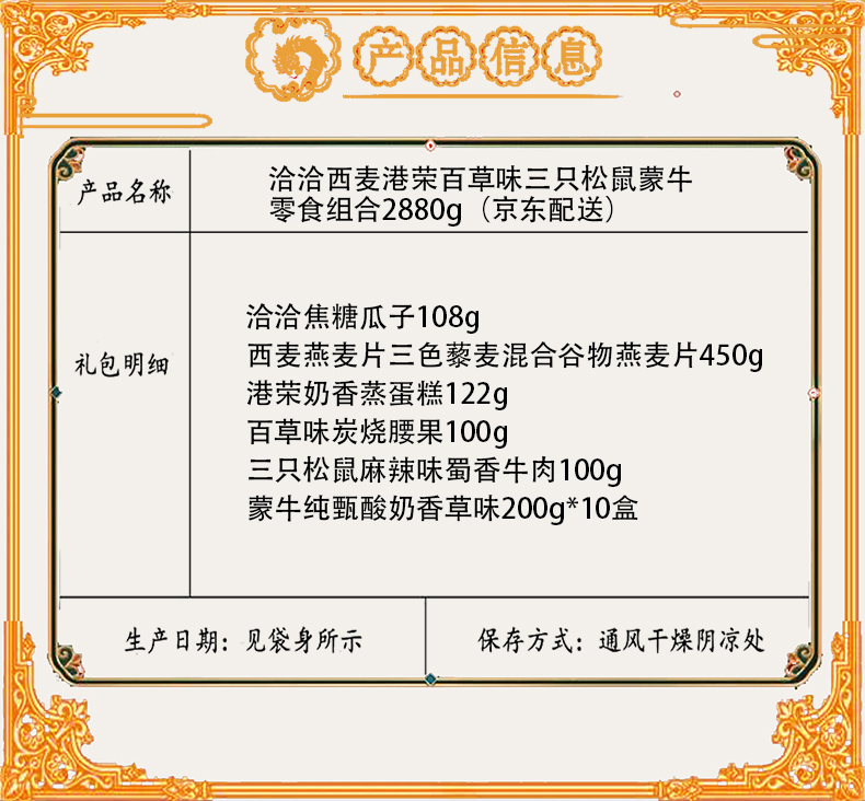 商品名称:【京东配送】洽洽西麦港荣百草味三只松鼠蒙牛零食组合2880g
