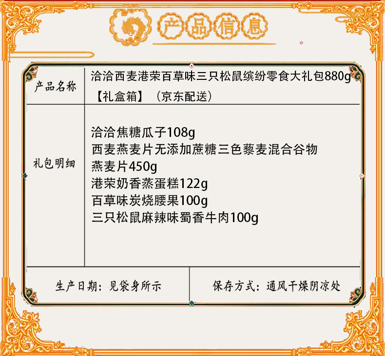 商品名称:【京东配送】洽洽西麦港荣百草味三只松鼠缤纷零食大礼包880g