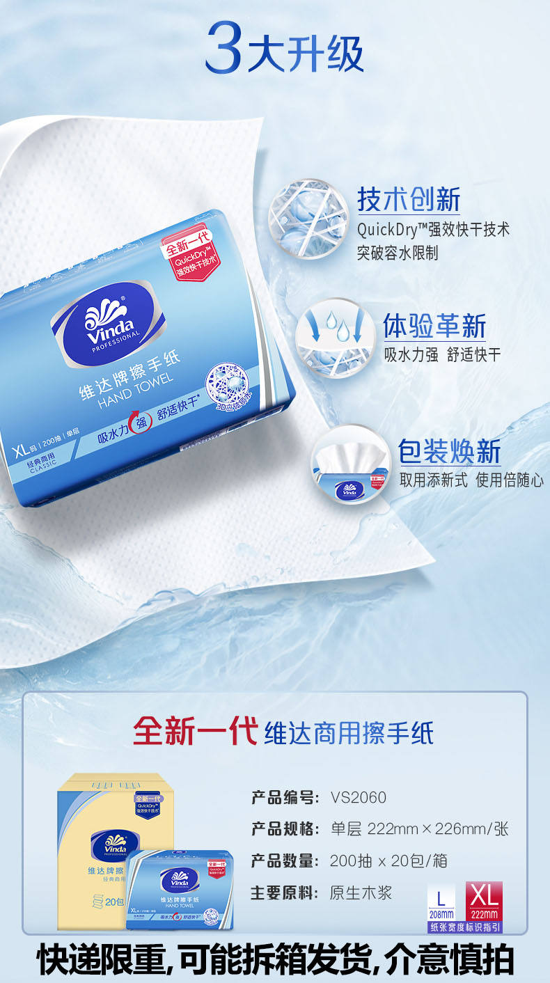 商品名称:Vinda/维达经典商务1层擦手纸整箱200抽*20包 XL码