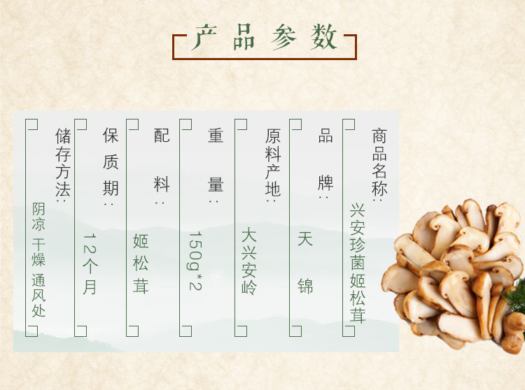 产品规格:天锦兴安珍菌姬松茸礼盒150g*2盒
