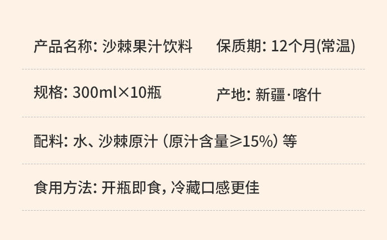 商品名称:疆果果沙棘果汁饮料整箱300ml*10瓶