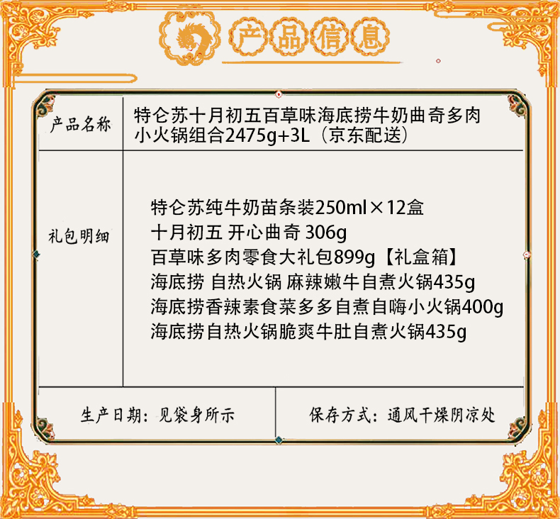 商品名称:【京东配送】蒙牛特仑苏十月初五百草味海底捞牛奶曲奇多肉小火锅组合2475g+3000ml